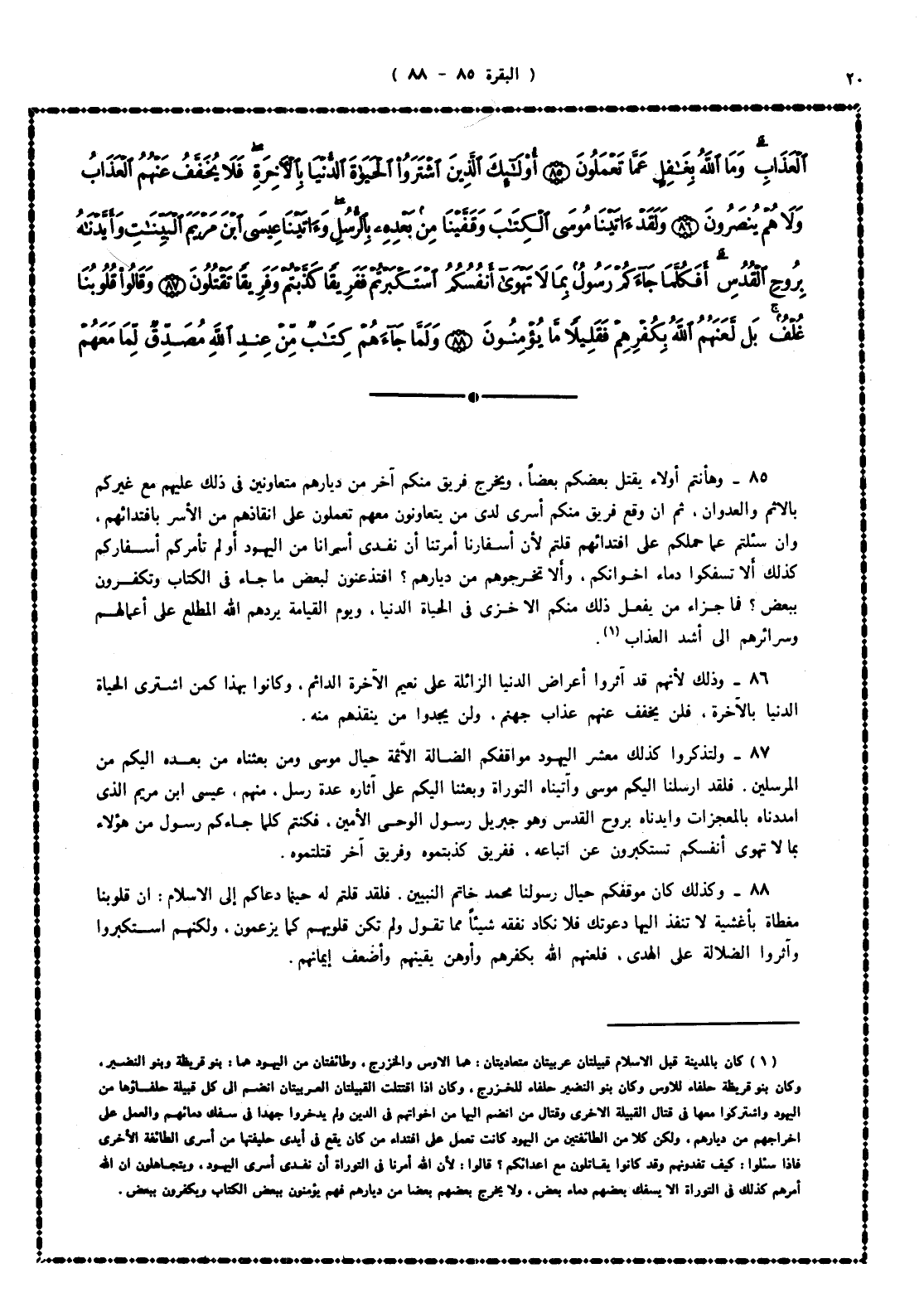 85 - وها أنتم أولاء يقتل بعضكم بعضا، ويخرج فريق منكم فريقاً آخر من ديارهم متعاونين فى ذلك عليهم مع غيركم بالإثم والعدوان، ثم إن وقع فريق منكم أسرى لدى من تتعاونون معهم تعملون على إنقاذهم من الأسر بافتدائهم، وإن سئلتم عما حملكم على افتدائهم قلتم: لأن أسفارنا أمرتنا أن نفدى أسرانا من اليهود، أو لم تأمركم أسفاركم كذلك ألا تسفكوا دماء إخوانكم، وألا تخرجوهم من ديارهم؟ ، أفتذعنون لبعض ما جاء فى الكتاب وتكفرون ببعض؟ فما جزاء من يفعل ذلك منكم إلا خزى فى الحياة الدنيا، ويوم القيامة يردهم الله - المطلع على أعمالهم وسرائرهم - إلى أشد العذاب.