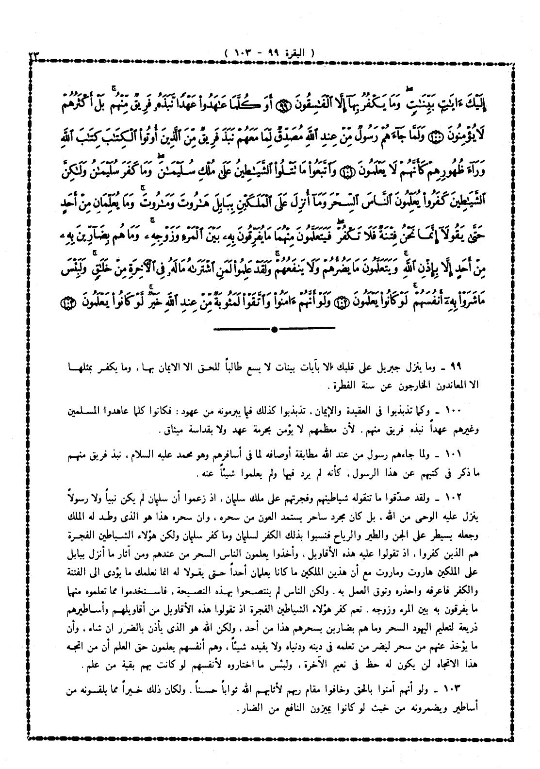 102 - ولقد صدَّقوا ما تَتَقَوَّله شياطينهم وفجرتهم على ملك سليمان، إذ زعموا أن سليمان لم يكن نبياً ولا رسولاً ينزل عليه الوحى من الله، بل كان مجرد ساحر يستمد العون من سحره، وأن سحره هذا هو الذى وطَّد له الملك وجعله يسيطر على الجن والطير والرياح، فنسبوا بذلك الكفرَ لسليمان، وما كفر سليمان، ولكن هؤلاء الشياطين الفجرة هم الذين كفروا، إذ تقوَّلوا عليه هذه الأقاويل، وأخذوا يعلِّمون الناس السحر من عندهم ومن آثار ما أنزل ببابل على الملكين هاروت وماروت، مع أن هذين الملكين ما كانا يعلِّمان أحداً حتى يقولا له: إنما نعلِّمك ما يؤدى إلى الفتنة والكفر فاعرفه واحذره وتَوَقَّ العمل به. ولكن الناس لم ينتصحوا بهذه النصيحة، فاستخدموا ما تعلَّموه منهما فيما يفرقون به بين المرء وزوجه. نعم كفر هؤلاء الشياطين الفجرة إذ تقوَّلوا هذه الأقاويل من أقاويلهم وأساطيرهم ذريعة لتعليم اليهود السحر، وما هم بضارين بسحرهم هذا من أحد، ولكن الله هو الذى يأذن بالضرر إن شاء، وأن ما يؤخذ عنهم من سحر سيضر من تعلَّمه فى دينه ودنياه ولا يفيده شيئاً، وهم أنفسهم يعلمون حق العلم أن من اتجه هذا الاتجاه لن يكون له حظ فى نعيم الآخرة، ولبئس ما اختاروه لأنفسهم لو كانت بهم بقية من علم.