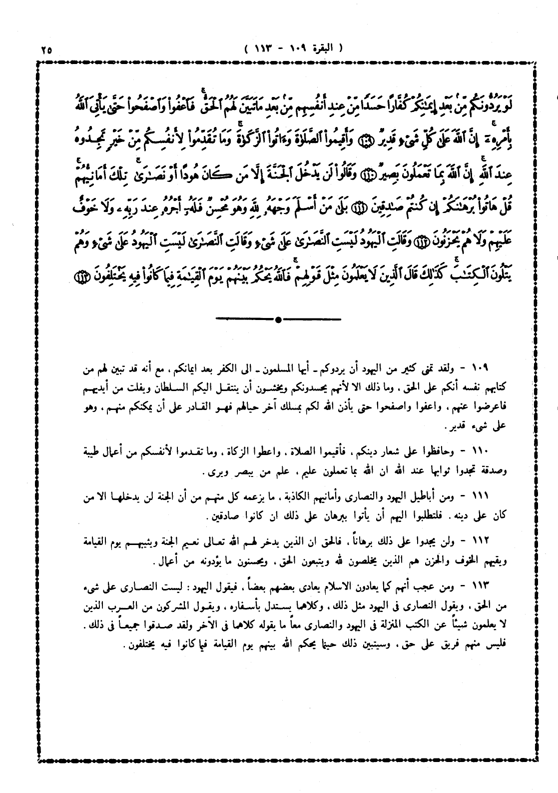 109 - ولقد تمنى كثير من اليهود أن يردوكم - أيها المسلمون - إلى الكفر بعد إيمانكم، مع أنه قد تبين لهم من كتابهم نفسه أنكم على الحق، وما ذلك إلا لأنهم يحسدونكم ويخشون أن ينتقل إليكم السلطان ويفلت من أيديهم، فأعرضوا عنهم، واعفوا واصفحوا حتى يأذن الله لكم بمسلك آخر حيالهم، فهو القادر على أن يمكنكم منهم، وهو على كل شئ قدير.