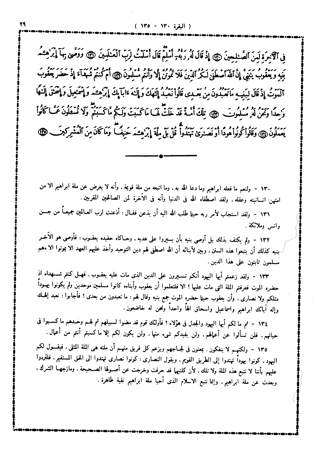 132 - ولم يكتف بذلك بل أوصى بنيه بأن يسيروا على هديه، وحاكاه حفيد يعقوب فأوصى هو الآخر بنيه كذلك أن يتبعوا هذه السنن، وبيّن لأبنائه أن الله اصطفى لهم دين التوحيد وأخذ عليهم العهد ألا يموتوا إلا وهم مسلمون ثابتون على هذا الدين.
