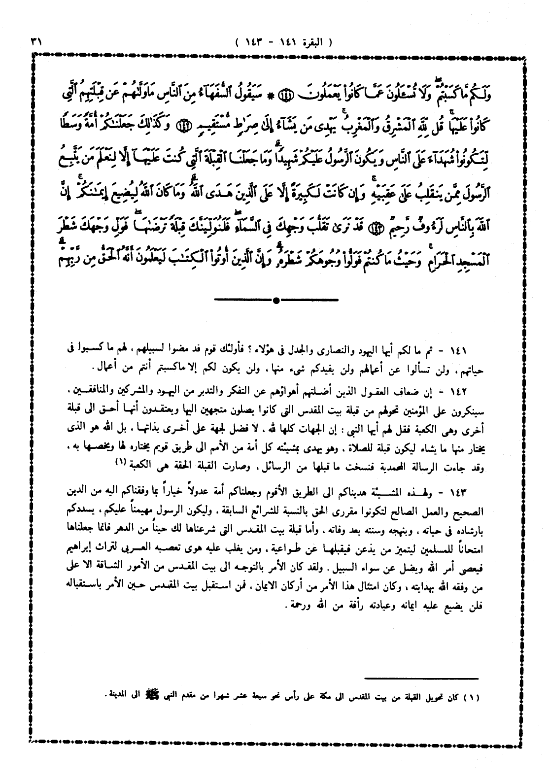 142 - إن ضعاف العقول الذين أضلتهم أهواؤهم عن التفكر والتدبر من اليهود والمشركين والمنافقين سينكرون على المؤمنين تحوَّلهم من قبلة بيت المقدس التى كانوا يصلّون متجهين إليها إلى قبلة أخرى وهى الكعبة، فقل لهم أيها النبى: إن الجهات كلها لله، لا فضل لجهة على أخرى بذاتها، بل الله هو الذى يختار منها ما يشاء ليكون قبلة للصلاة، وهو يهدى بمشيئته كل أمة من الأمم إلى طريق قويم يختاره لها ويخصها به، وقد جاءت الرسالة المحمدية فنسخت ما قبلها من الرسالات، وصارت القبلة الحقة هى الكعبة.
