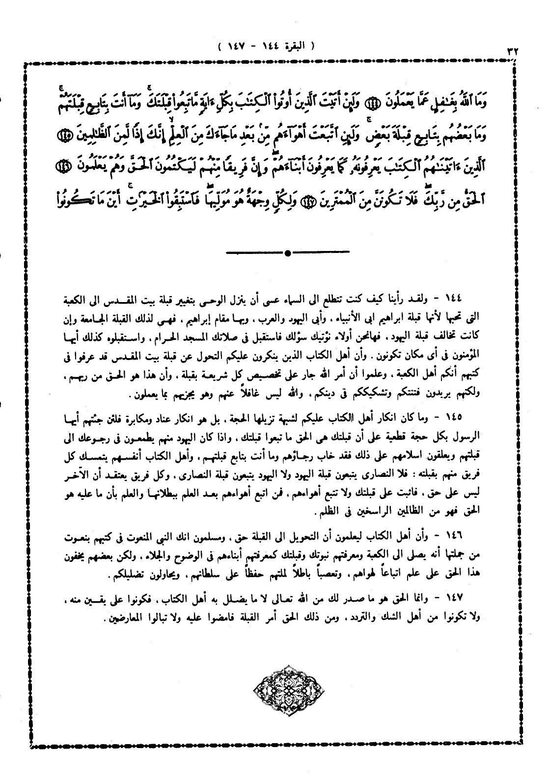 147 - وإنما الحق هو ما صدر لك من الله تعالى لا ما يضلَّل به أهل الكتاب، فكونوا على يقين منه، ولا تكونوا من أهل الشك والتردد، ومن ذلك الحقِّ أمرُ تحول القبلة إلى البيت الحرام فامضوا عليه ولا تبالوا بالمعارضين.
