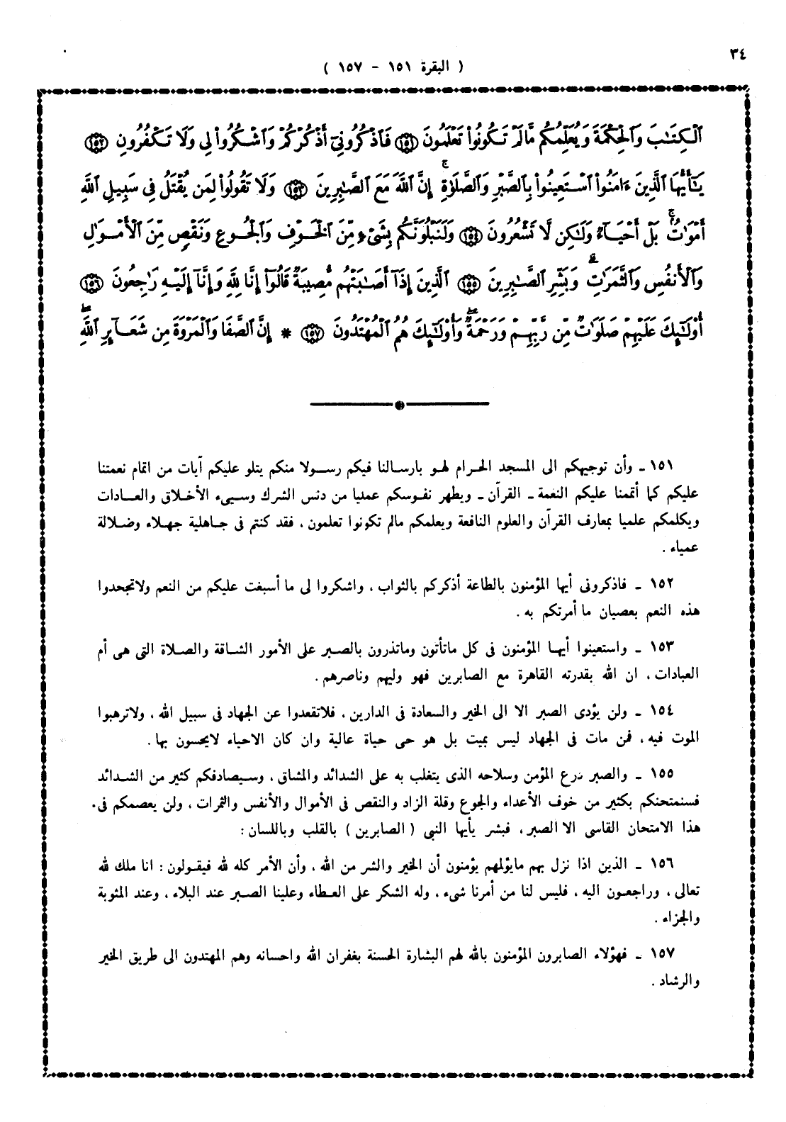 151 - وإن توجيهكم إلى المسجد الحرام بإرسالنا فيكم رسولا منكم يتلو عليكم آيات من إتمام نعمتنا عليكم كما أتممنا عليكم النعمة - القرآن - ويطهر نفوسكم عمليا من دنس الشرك وسيئ الأخلاق والعادات ويكملكم علمياً بمعارف القرآن والعلوم النافعة ويعلمكم ما لم تكونوا تعلمون، فقد كنتم فى جاهلية جهلاء وضلالة عمياء.