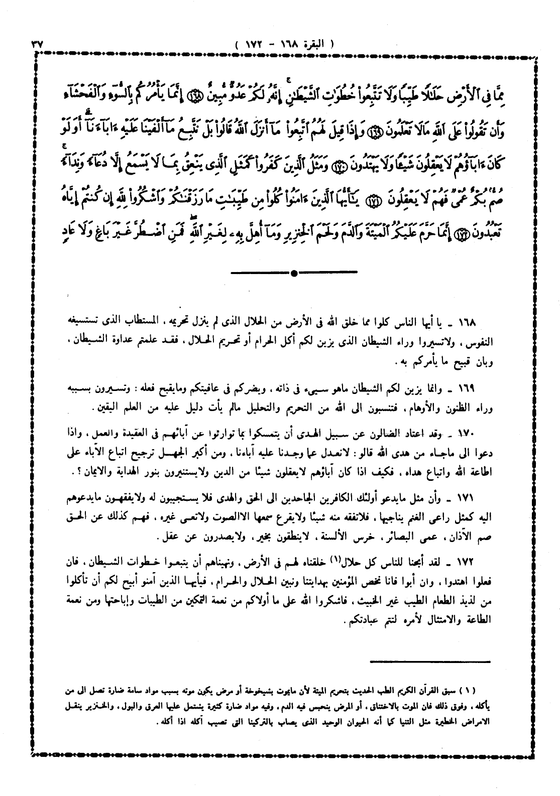 168 - يا أيها الناس كُلوا مما خلق الله فى الأرض من الحلال الذى لم ينزل تحريمه، المستطاب الذى تستسيغه النفوس، ولا تسيروا وراء الشيطان الذى يزيِّن لكم أكل الحرام أو تحريم الحلال، فقد علمتم عداوة الشيطان، وبان قبيح ما يأمركم به.