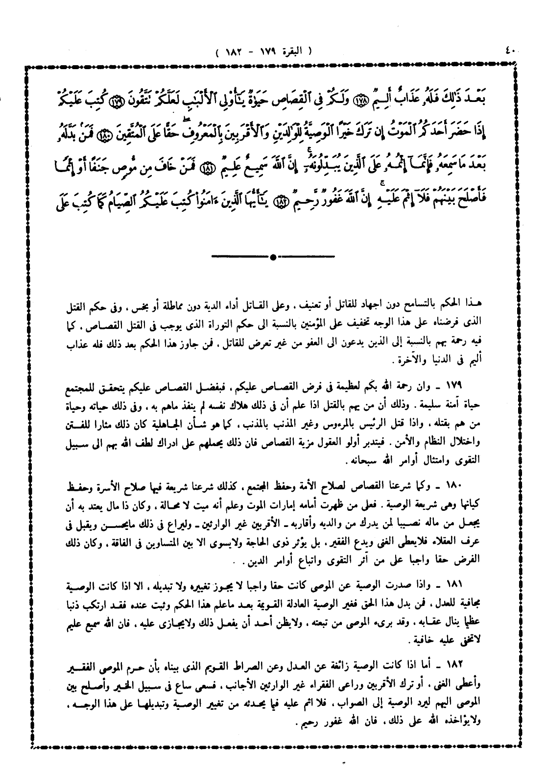 180 - وكما شرع الله القصاص لصلاح الأمة وحفظ المجتمع، كذلك شرع الله شريعة فيها صلاح الأسرة وحفظ كيانها وهى شريعة الوصية، فعلى من ظهرت أمامه إمارات الموت وعلم أنه ميت لا محالة، وكان ذا مال يعتد به أن يجعل من ماله نصيباً لمن يدرك من والديه وأقاربه - الأقربين غير الوارثين - وليراع فى ذلك ما يحسن ويقبل فى عرف العقلاء فلا يعطى الغنى ويدع الفقير، بل يؤثر ذوى الحاجة ولا يسوى إلا بين المتساوين فى الفاقة، وكان ذلك الفرض حقاً واجباً على من آثر التقوى واتبع أوامر الدين.