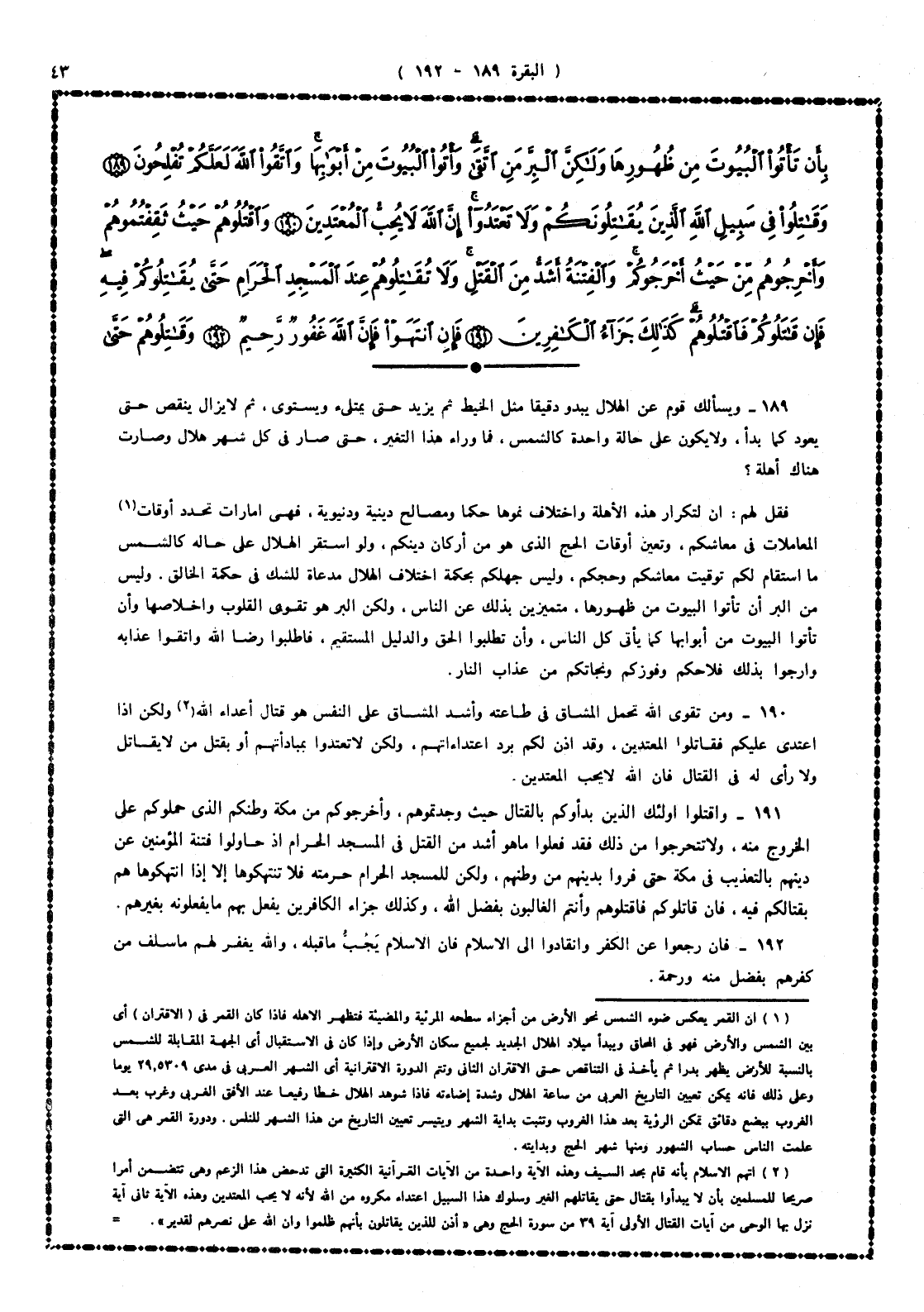 189 - ويسألك قوم عن الهلال يبدو دقيقاً مثل الخيط ثم يزيد حتى يكتمل ويستوى، ثم لا يزال ينقص حتى يعود كما بدأ، ولا يكون على حالة واحدة كالشمس. فما وراء هذا التغير، حتى صار فى كل شهر هلال وصارت هناك أهلة؟ . فقل لهم: إن لتكرار هذه الأهلة واختلاف نموها حِكَماً ومصالح دينية ودنيوية، فهى أمارات تحدد أوقات المعاملات فى معاشكم، وتعيِّن أوقات الحج الذى هو من أركان دينكم، ولو استقر الهلال على حاله كالشمس ما استقام لكم توقيت معاشكم وحجكم، وليس جهلكم بحكمة اختلاف الهلال مدعاة للشك فى حكمة الخالق، وليس من البر أن تأتوا البيوت من ظهورها، متميزين بذلك عن الناس، ولكن البر هو تقوى القلوب وإخلاصها وأن تأتوا البيوت من أبوابها كما يأتى كل الناس، وأن تطلبوا الحق والدليل المستقيم، فاطلبوا رضا الله، واتقوا عذابه، وارجوا بذلك فَلاَحَكُمْ وفوزكم ونجاتكم من عذاب النار.