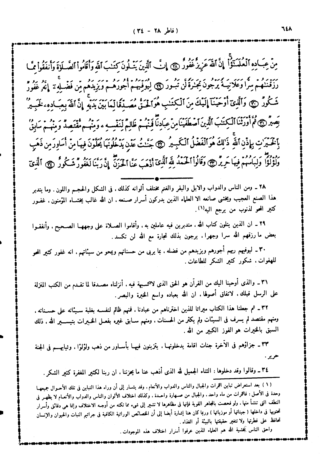 29 - إن الذين يتلون كتاب الله، متدبرين فيه عاملين به، وأقاموا الصلاة على وجهها الصحيح، وأنفقوا بعض ما رزقهم الله سراً وجهراً، يرجون بذلك تجارة مع الله لن تكسد.