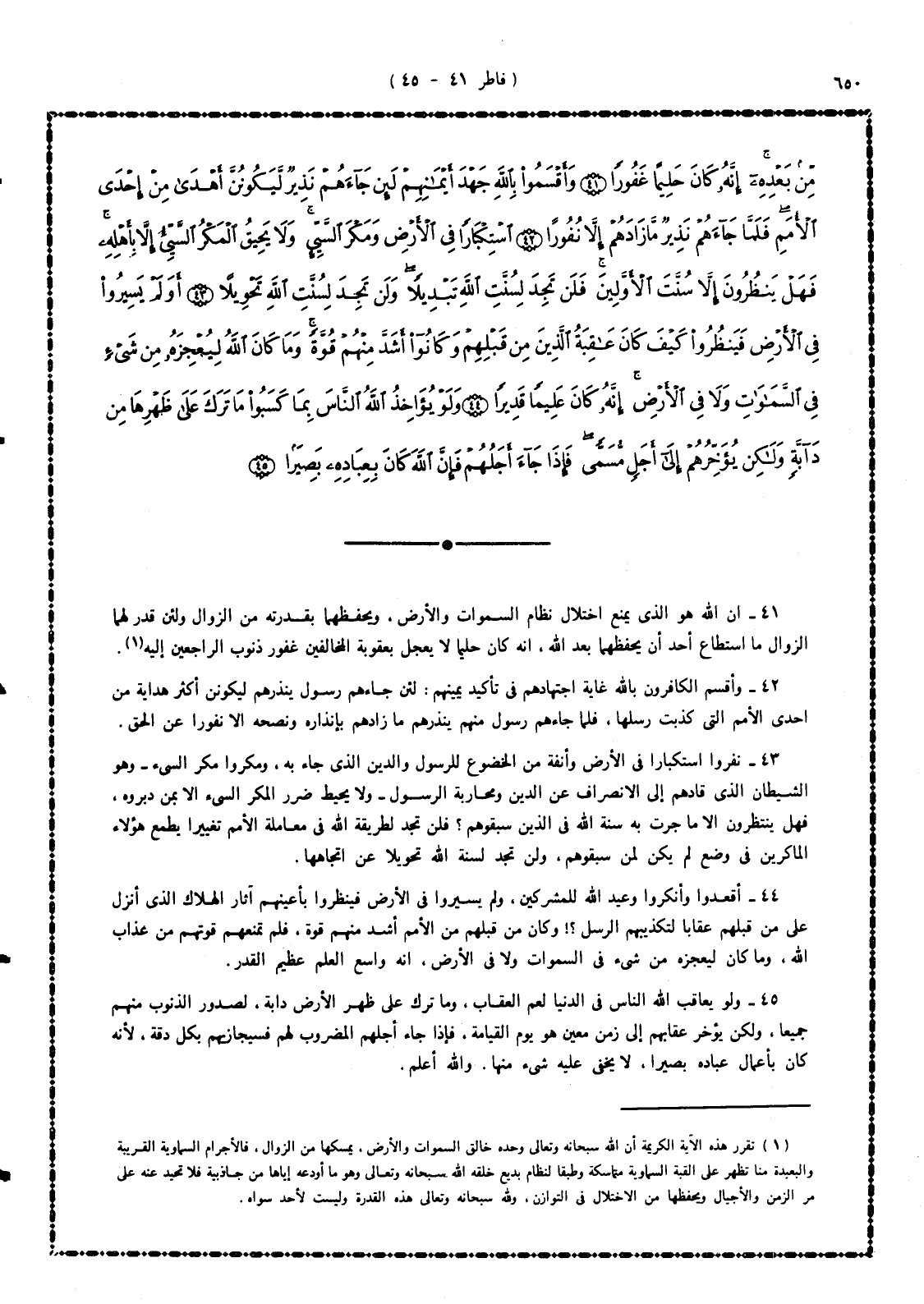 41 - إن الله هو الذى يمنع اختلال نظام السموات والأرض، ويحفظهما بقدرته من الزوال، ولئن قدِّر لهما الزوال ما استطاع أحد أن يحفظهما بعد الله. إنه كان حليماً لا يُعجل بعقوبة المخالفين غفوراً لذنوب الراجعين إليه.