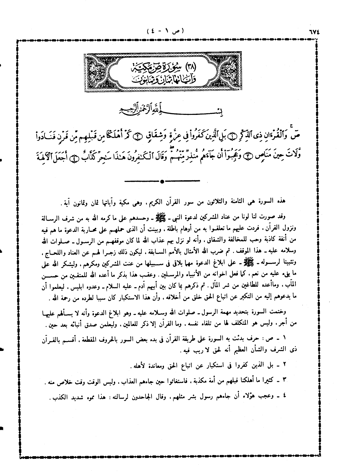 1 - ص: حرف بدئت به السورة على طريقة القرآن فى بدء بعض السور بالحروف المقطعة، أقسم بالقرآن ذى الشرف والشأن العظيم إنه لحق لا ريب فيه.