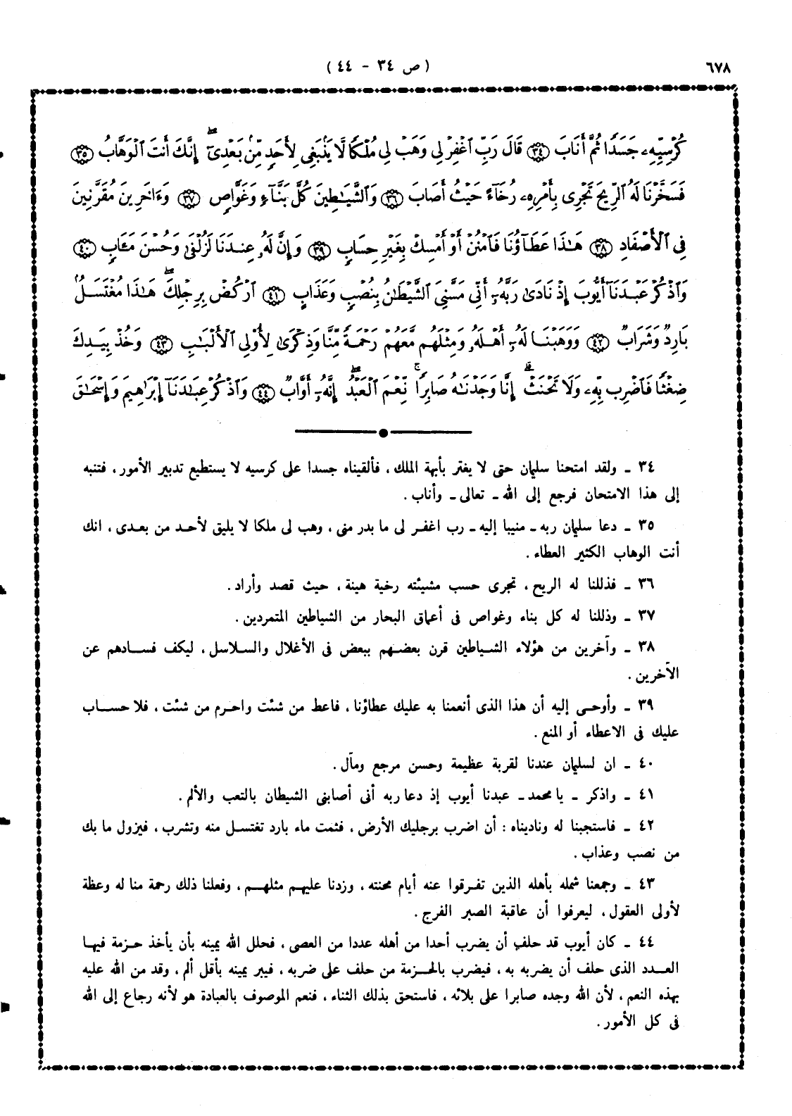 34 - ولقد امتحنا سليمان حتى لا يغتر بأبَّهة الملك، فألقينا جسداً على كرسيه لا يستطيع تدبير الأمور، فتنبه إلى هذا الامتحان فرجع إلى الله - تعالى - وأناب.