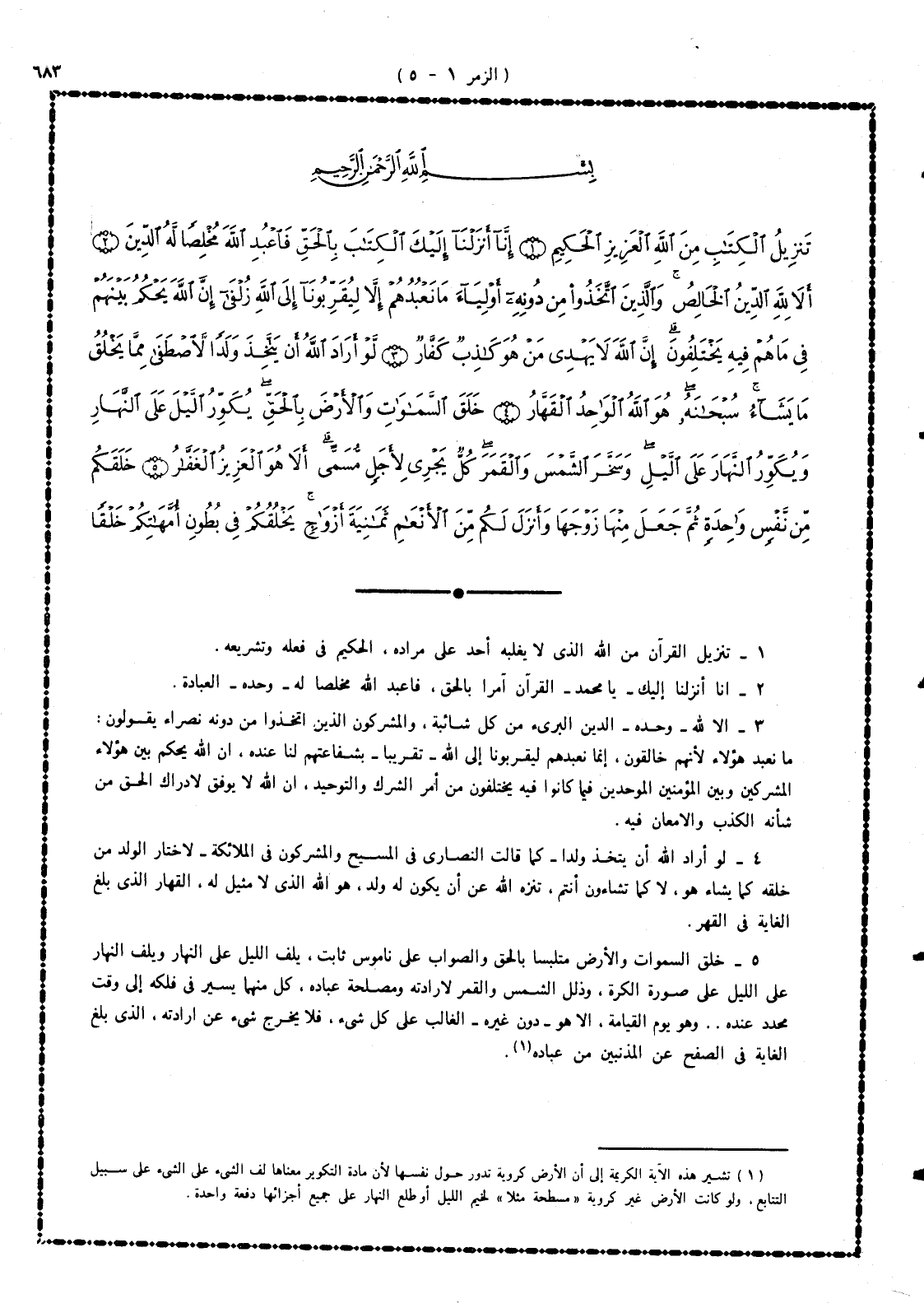 5 - خلق السموات والأرض متصفا دائماً بالحق والصواب على ناموس ثابت، يلف الليل على النهار ويلف النهار على الليل على صورة الكرة، وذلل الشمس والقمر لإرادته ومصلحة عباده، كل منهما يسير فى فلكه إلى وقت محدد عنده، وهو يوم القيامة، ألا هو - دون غيره - الغالب على كل شئ، فلا يخرج شئ عن إرادته، الذى بلغ الغاية فى الصفح عن المذنبين من عباده.