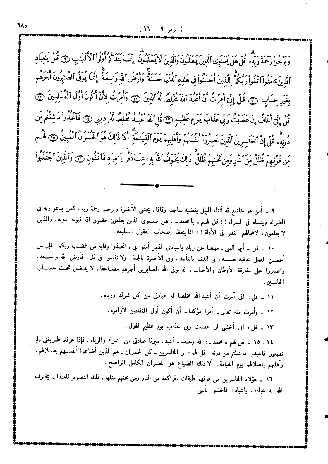 9 - أَمَّن هو خاشع لله أثناء الليل يقضيه ساجداً وقائماً، يخشى الآخرة ويرجو رحمة ربه. كمن يدعو ربه فى الضراء وينساه فى السراء؟! قل لهم - يا محمد -: هل يستوى الذين يعلمون حقوق الله فيوحدونه، والذين لا يعلمون، لإهمالهم النظر فى الأدلة؟ إنما يتعظ أصحاب العقول السليمة.