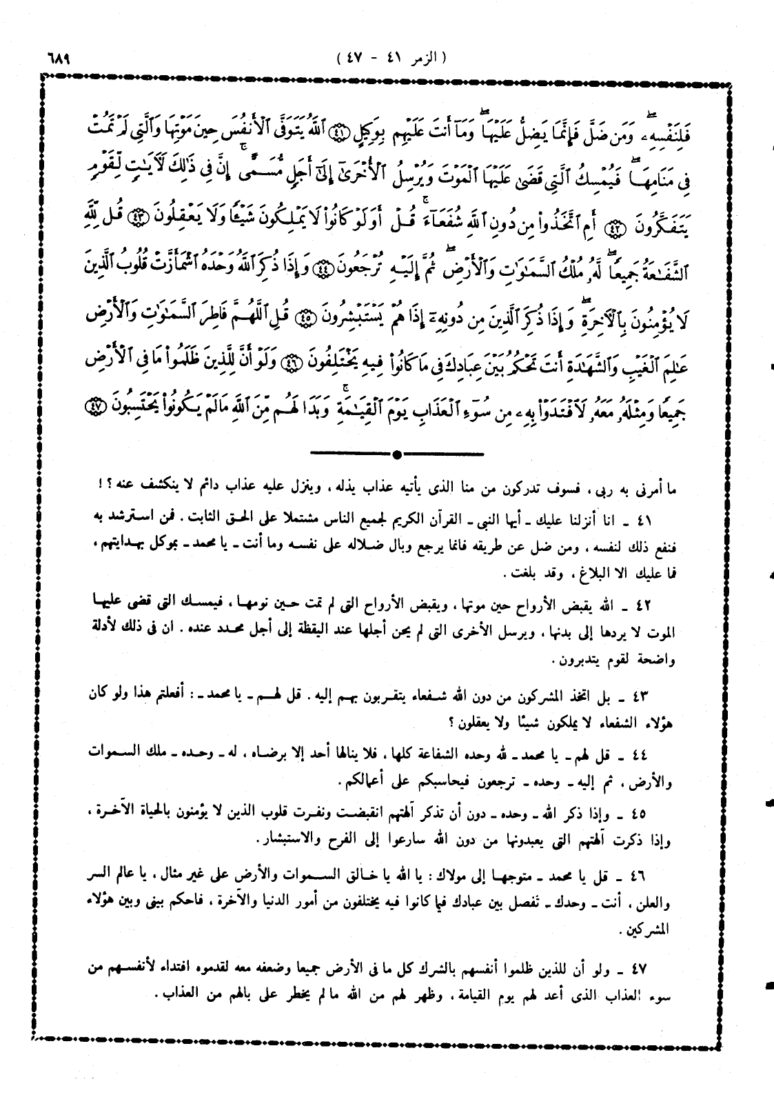 42 - الله يقبض الأرواح حين موتها، ويقبض الأرواح التى لم تمت حين نومها، فيُمسك التى قضى عليها الموت لا يردها إلى بدنها، ويُرسل الأخرى التى لم يحن أجلها عند اليقظة إلى أجل محدد عنده. إن فى ذلك لأدلة واضحة لقوم يتدبرون.