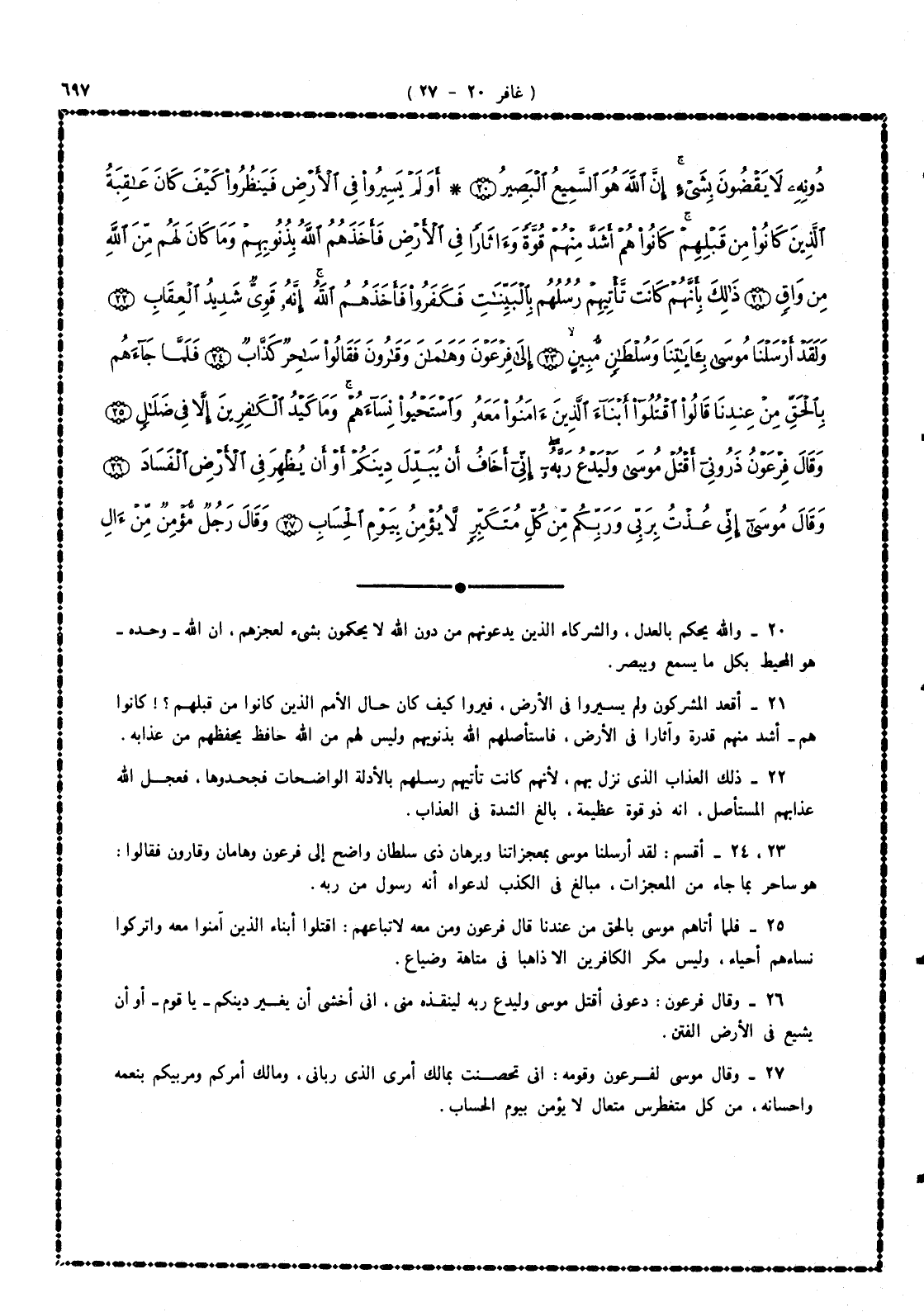 23 -، 24 - لقد أرسلنا موسى بمعجزاتنا وبرهان ذى سلطان واضح إلى فرعون وهامان وقارون فقالوا: هو ساحر بما جاء من المعجزات، مبالغ فى الكذب لدعواه أنه رسول من ربه.