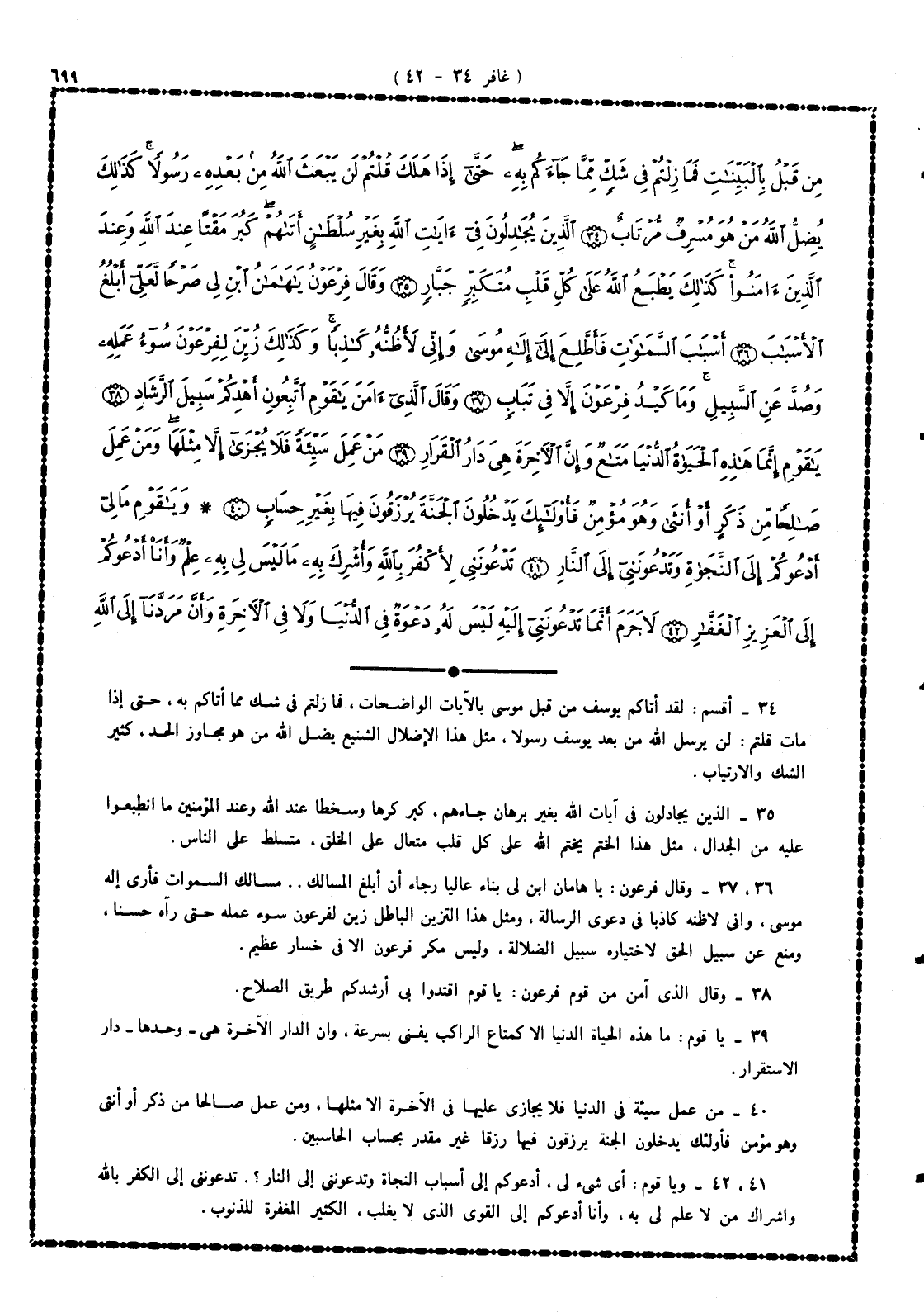 34 - لقد أتاكم يوسف من قبل موسى بالآيات الواضحات، فما زلتم فى شك مما أتاكم به، حتى إذا مات قلتم: لن يرسل الله من بعد يوسف رسولا، مثل هذا الإضلال الشنيع يُضل الله من هو مجاوز الحد، كثير الشك والارتياب.