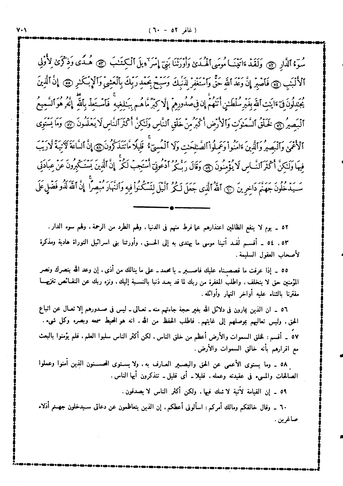 56 - إن الذين يمارون فى دلائل الله بغير حُجة منه - تعالى - ليس فى صدورهم إلا تعال عن اتباع الحق، وليس تعاليهم بموصلهم إلى غايتهم، فاطلب الحفظ من الله، إنه هو المحيط سمعه وبصره بكل شئ.