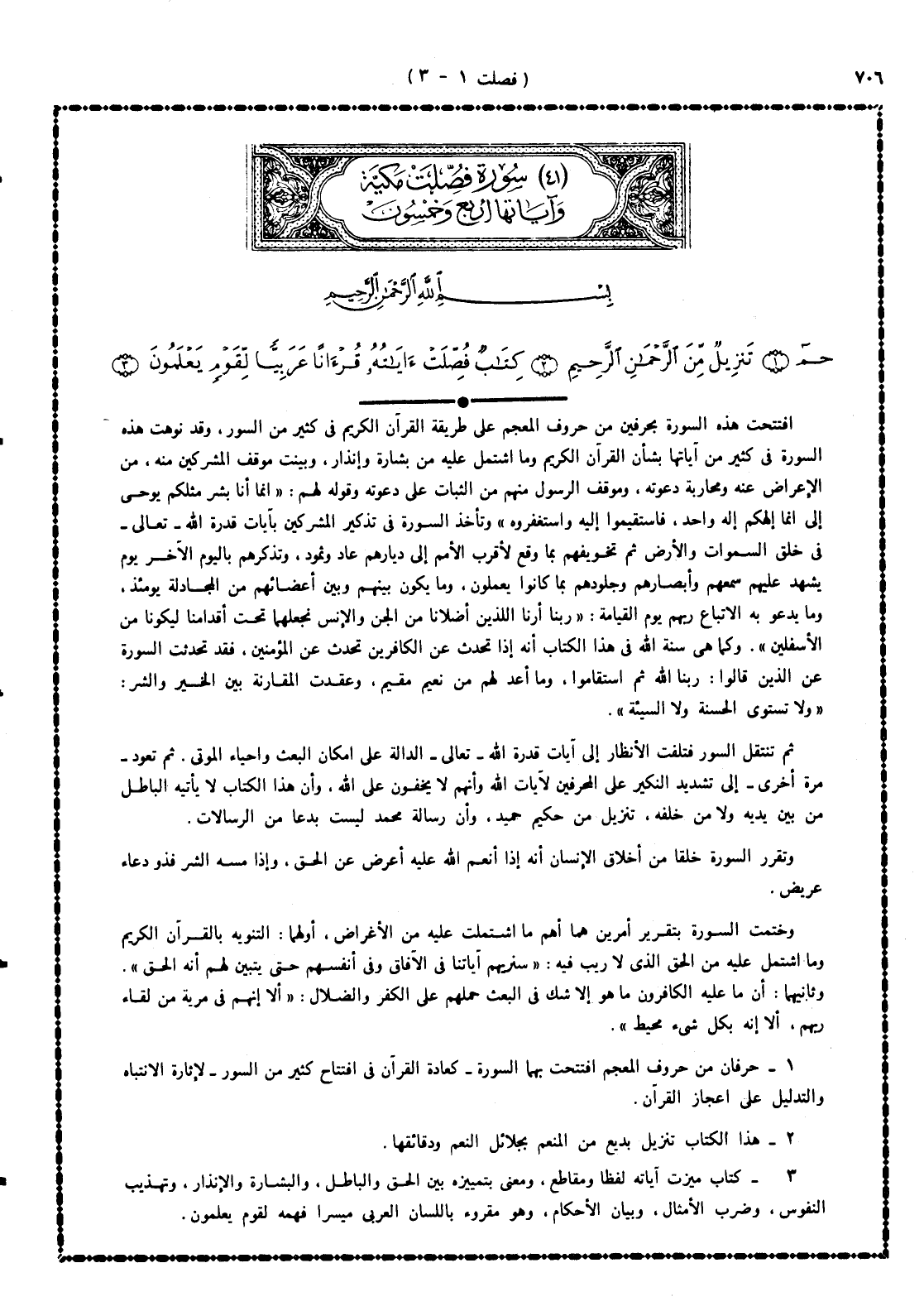 3 - كتاب ميزت آياته لفظاً ومقاطع، ومعنى بتمييزه بين الحق والباطل، والبشارة والإنذار، وتهذيب النفوس، وضرب الأمثال، وبيان الأحكام، وهو مقروء باللسان العربى ميسراً فهمه لقوم يعلمون.