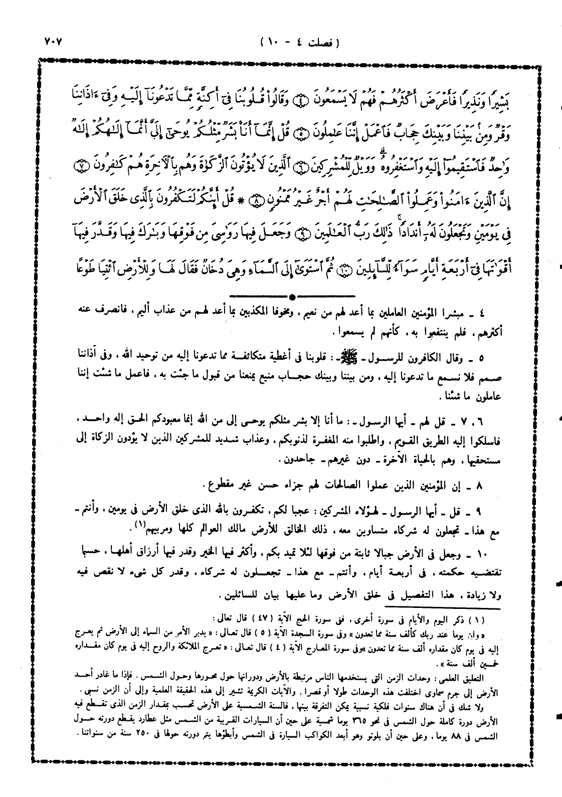 9 - قل - أيها الرسول - لهؤلاء المشركين: عجباً لكم، تكفرون بالله الذى خلق الأرض فى يومين، وأنتم - مع هذا - تجعلون له شركاء متساوين معه، ذلك الخالق للأرض مالك العوالم كلها ومربيهم.