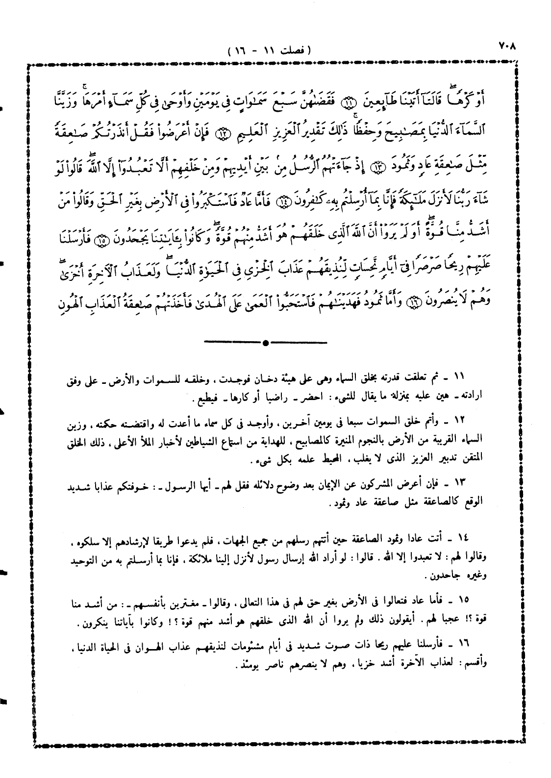 16 - فأرسلنا عليهم ريحاً ذات صوت شديد فى أيام مشئومات لنذيقهم عذاب الهون فى الحياة الدنيا، وأقسم: لعذاب الآخرة أشد خزياً، وهم لا ينصرهم ناصر يومئذ.