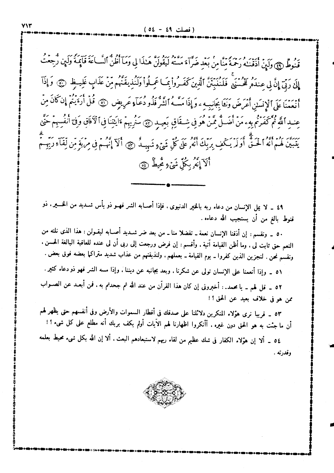 50 - ونقسم: إن أذقنا الإنسان نعمة - تفضلا منا - من بعد ضر شديد أصابه ليقولن: هذا الذى نلته من النعم حق ثابت لى، وما أظن القيامة آتية، وأقسم: إن فُرِضَ ورجعت إلى ربى إن لى عنده للعاقبة البالغة الحسن. ونقسم نحن لنجزين الذين كفروا - يوم القيامة - بعملهم، ولنذيقنهم من عذاب شديد متراكماً بعضه فوق بعض.