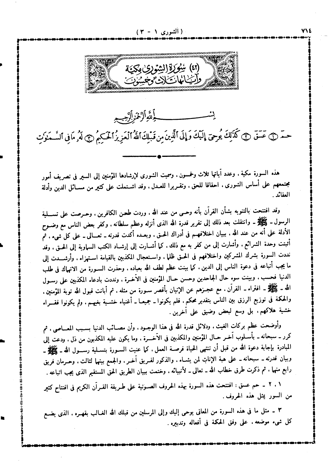 1 -، 2 - حم. عسق: افتتحت هذه السورة بهذه الحروف الصوتية على طريقة القرآن الكريم فى افتتاح كثير من السور بمثل هذه الحروف.
