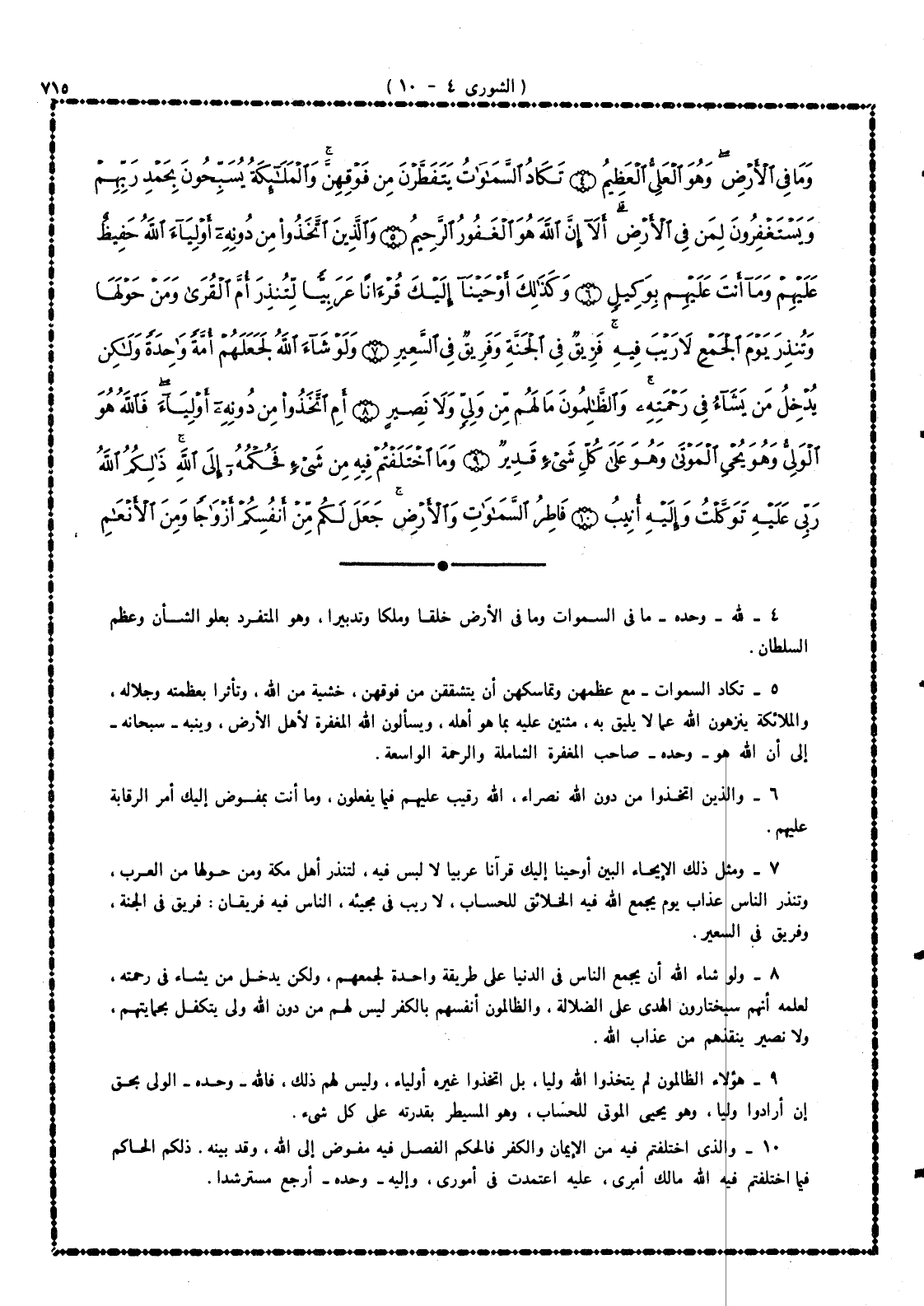 5 - تكاد السموات - مع عِظَمِهِن وتماسكهن - أن يتشققن من فوقهن، خشية من الله، وتأثراً بعظمته وجلاله، والملائكة ينزهون الله عما لا يليق به، مثنين عليه بما هو أهله، ويسألون الله المغفرة لأهل الأرض، وينبه - سبحانه - إلى أن الله هو - وحده - صاحب المغفرة الشاملة والرحمة الواسعة.