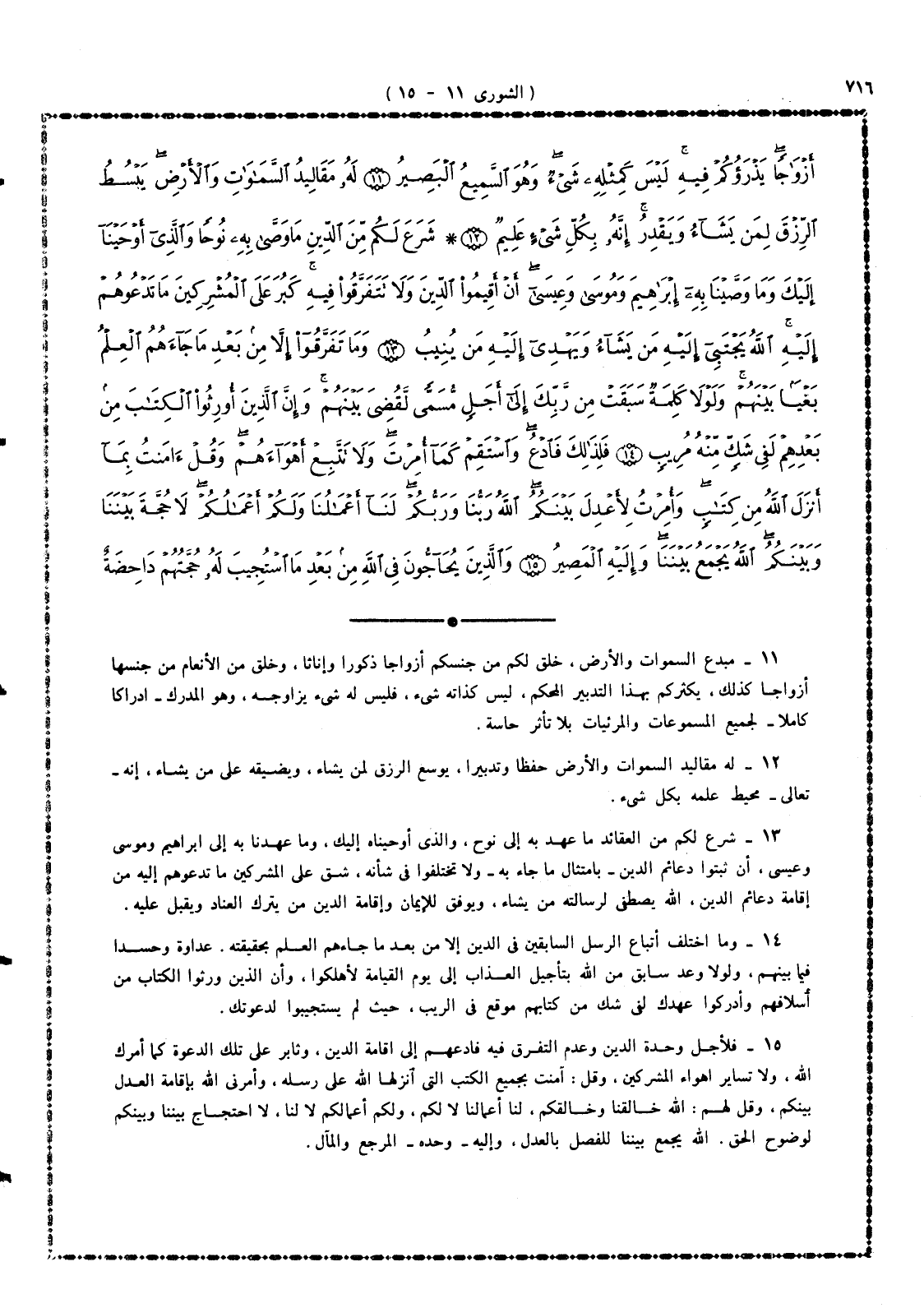 11 - مُبدع السموات والأرض، خلق لكم من جنسكم أزواجاً ذكوراً وإناثاً، وخلق من الأنعام من جنسها أزواجاً كذلك، يكثِّركم بهذا التدبير المحكم، ليس كذاته شئ، فليس له شئ يزاوجه، وهو المدرك - إدراكاً كاملاً - لجميع المسموعات والمرئيات بلا تأثر حاسة.