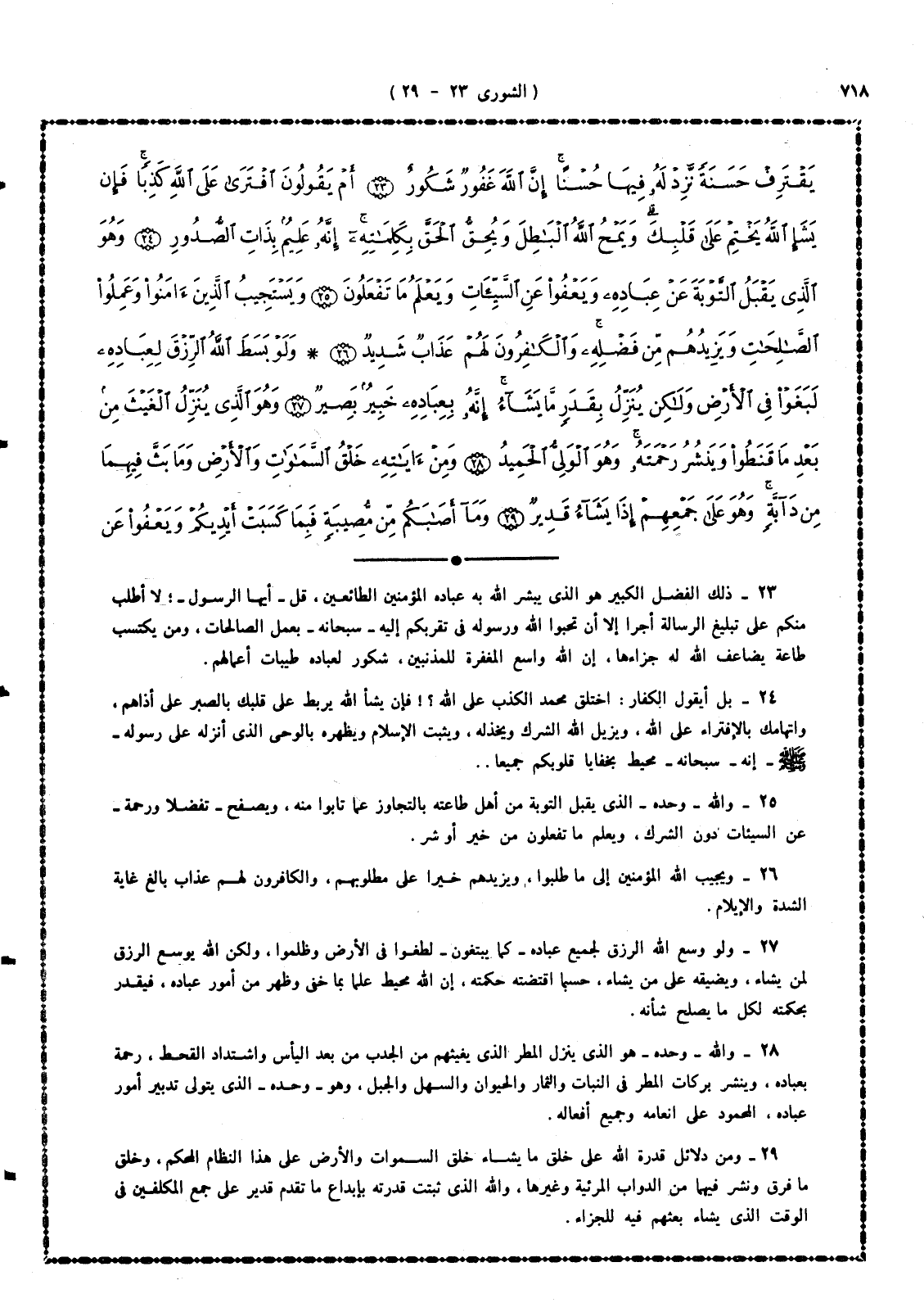 23 - ذلك الفضل الكبير هو الذى يُبشِّر الله به عباده المؤمنين الطائعين، قل - أيها الرسول -: لا أطلب منكم على تبليغ الرسالة أجراً إلا أن تحبوا الله ورسوله فى تقربكم إليه - سبحانه - بعمل الصالحات، ومن يكتسب طاعة يُضاعف الله له جزاءها، إن الله واسع المغفرة للمذنبين، شكور لعباده طيبات أعمالهم.