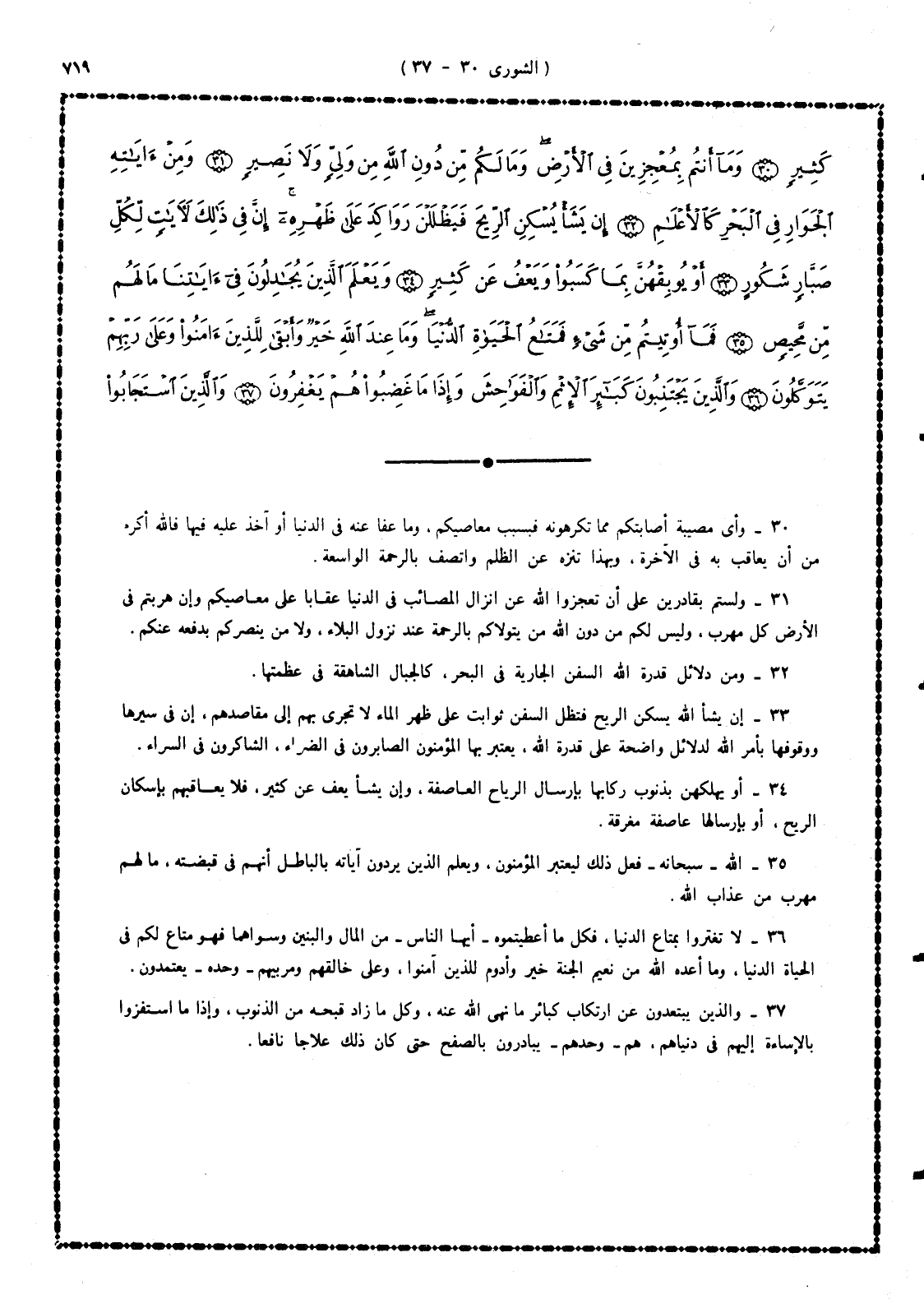 33 - إن يشأ الله يُسْكِن الريح فتظل السفن ثوابت على ظهر الماء لا تجرى بهم إلى مقاصدهم، إن فى سيرها ووقوفها بأمر الله لدلائل واضحة على قدرة الله، يعتبر بها المؤمنون الصابرون فى الضراء، الشاكرون فى السراء.