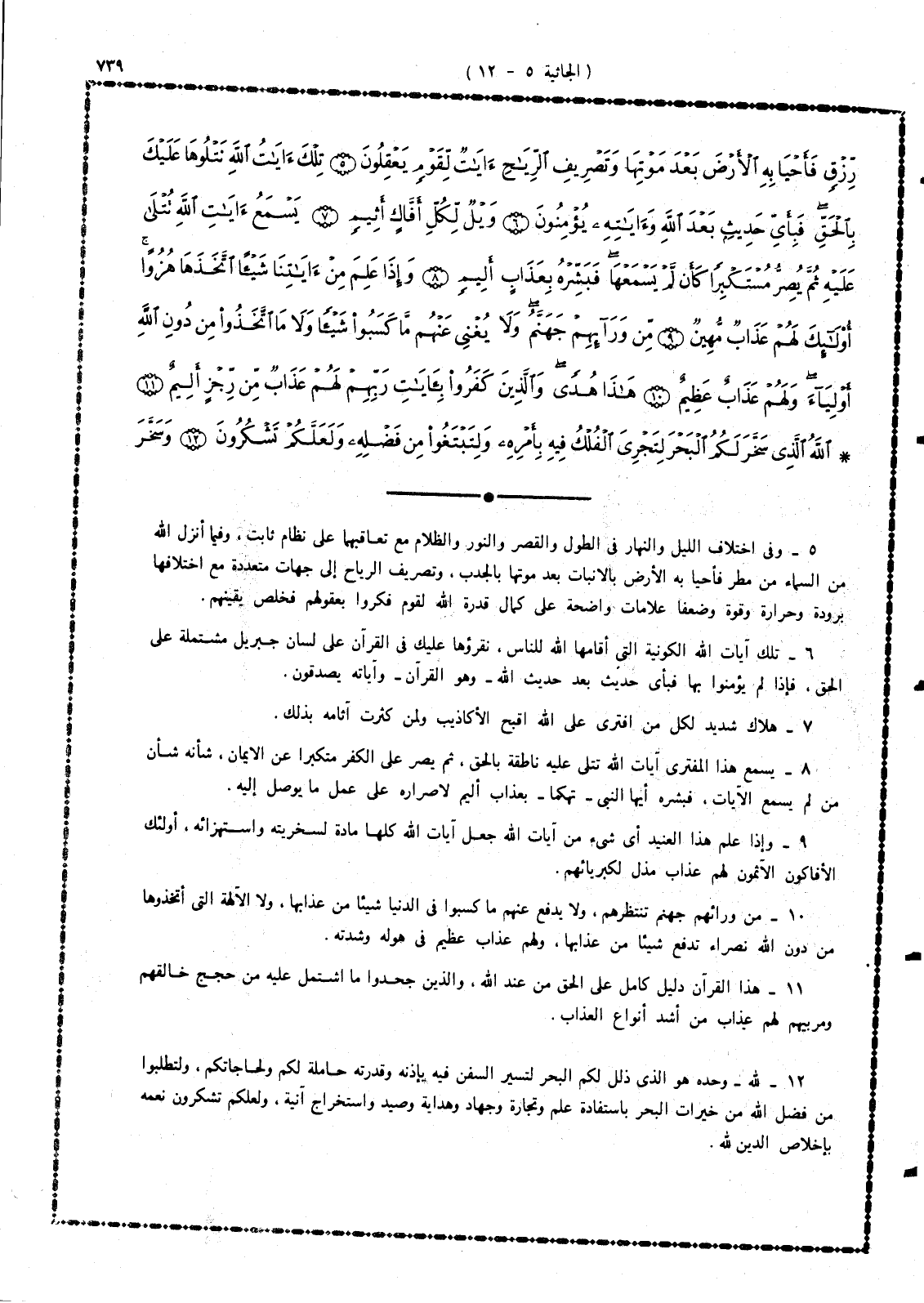 12 - الله - وحده - هو الذى ذلل لكم البحر لتسير السفن فيه بإذنه وقدرته حاملة لكم ولحاجاتكم، ولتطلبوا من فضل الله من خيرات البحر باستفادة علم وتجارة وجهاد وهداية وصيد، واستخراج آنية، ولعلكم تشكرون نعمه بإخلاص الدين لله.