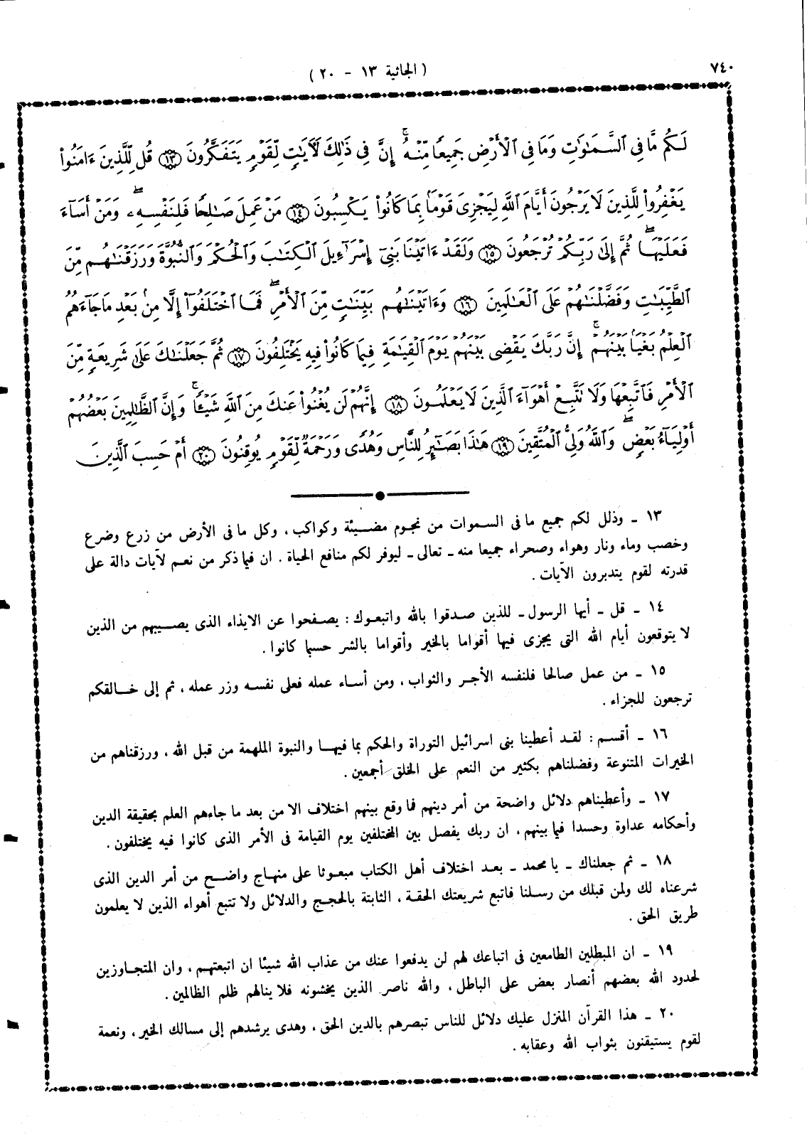 13 - وذلل لكم جميع ما فى السموات من نجوم مضيئة وكواكب، وكل ما فى الأرض من زرع وضرع وخصب وماء ونار وهواء وصحراء جميعاً منه - تعالى - ليوفر لكم منافع الحياة. إن فيما ذكر من نعم لآيات دالة على قدرته لقوم يتدبرون الآيات.