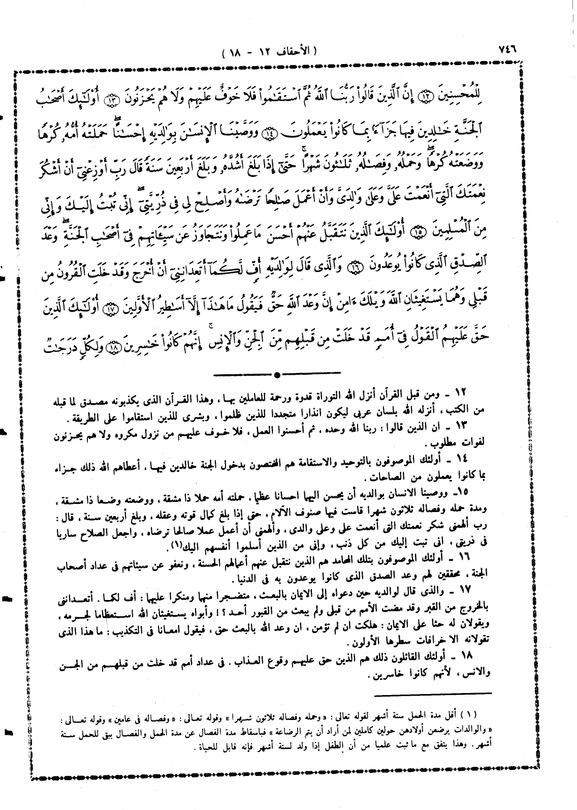 15 - ووصينا الإنسان بوالديه أن يحسن إليهما إحساناً عظيماً، حملته أمه حملاً ذا مشقة، ووضعته وضعاً ذا مشقة، ومدة حمله وفصاله ثلاثون شهراً قاست فيها صنوف الآلام، حتى إذا بلغ كمال قوته وعقله، وبلغ أربعين سنة، قال: رب ألهمنى شكر نعمتك التى أنعمت علىَّ وعلى والدى، وألهمنى أن أعمل عملاً صالحاً ترضاه، واجعل الصلاح سارياً فى ذريتى، إنى تبت إليك من كل ذنب، وإنى من الذين أسلموا أنفسهم إليك.