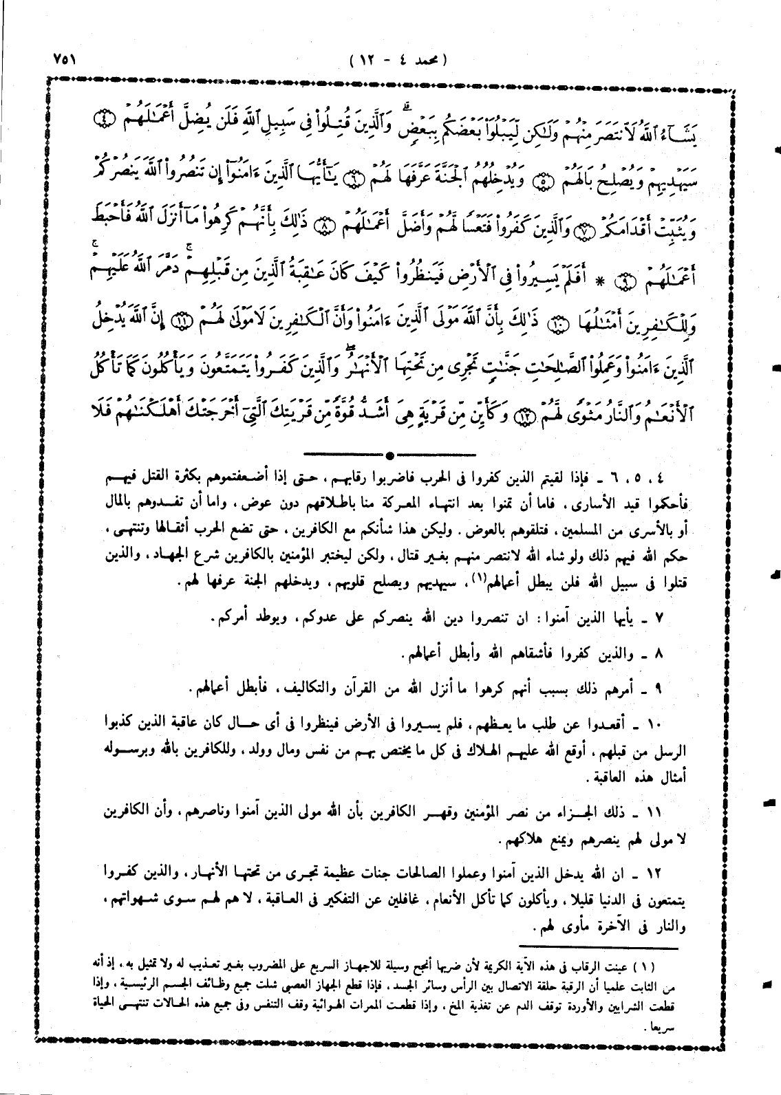 4 -، 5، 6 - فإذا لقيتم الذين كفروا فى الحرب فاضربوا رقابهم، حتى إذا أضعفتموهم بكثرة القتل فيهم فاحكموا قيد الأسارى، فإما أن تمنوا بعد انتهاء المعركة مناً بإطلاقهم دون عوض، وإمَّا أن تقبلوا أن يفتدوا بالمال أو بالأسرى من المسلمين. وليكن هذا شأنكم مع الكافرين، حتى تضع الحرب أثقالها وينتهى، فهذا حكم الله فيهم، ولو شاء الله لانتصر منهم بغير قتال، وليختبر المؤمنين بالكافرين شرع الجهاد، والذين قتلوا فى سبيل الله فلن يُبطل أعمالهم، سيهديهم ويصلح قلوبهم، ويدخلهم الجنة عرَّفها لهم.
