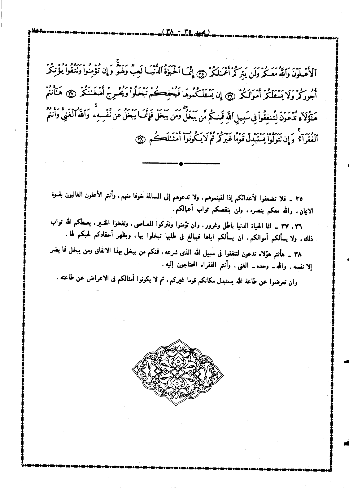 36 -، 37 - إنما الحياة الدنيا باطل وغرور، وإن تؤمنوا وتتركوا المعاصى وتفعلوا الخير يُعْطكم الله ثواب ذلك، ولا يسألكم أموالكم، إن يسألكم إيَّاها فيبالغ فى طلبها تبخلوا بها، ويظهر أحقادكم لحبكم لها.