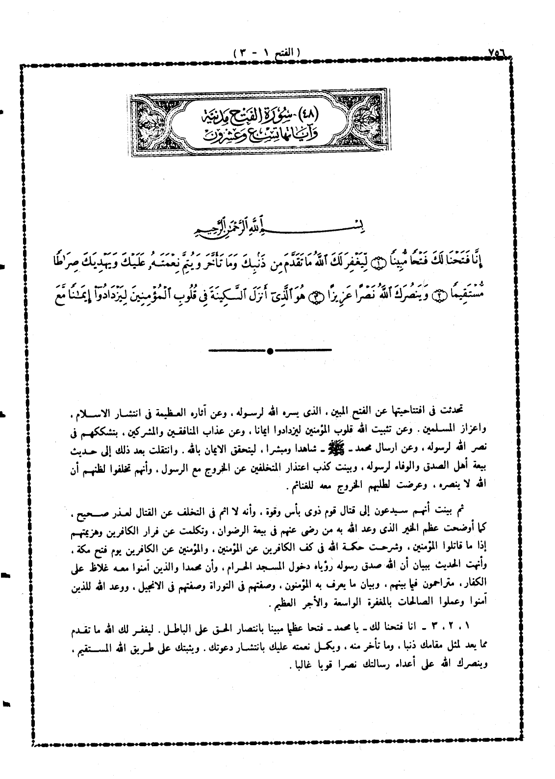 1 -، 2، 3 - إنا فتحنا لك - يا محمد - فتحا عظيما مبينا بانتصار الحق على الباطل، ليغفر لك الله ما تقدَّم مما يُعَدُّ لمثل مقامك ذنبا، وما تأخر منه، ويكمل نعمته عليك بانتشار دعوتك، ويُثَبِّتَكَ على طريق الله المستقيم، وينصرك الله على أعداء رسالتك نصراً قويا غاليا.