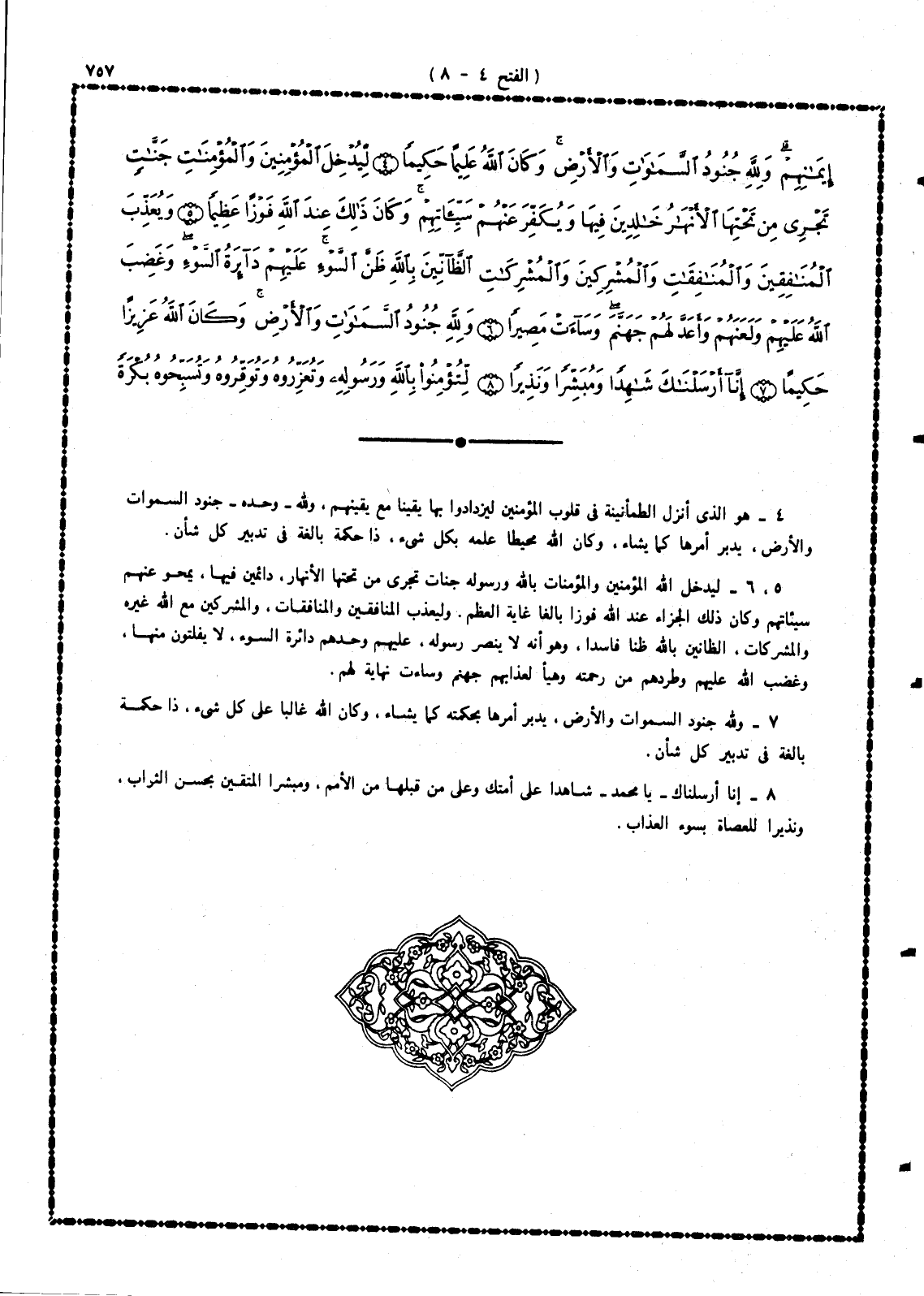 4 - هو الله الذى أنزل الطمأنينة فى قلوب المؤمنين ليزدادوا بها يقينا مع يقينهم، ولله - وحده - جنود السموات والأرض، يدبِّر أمرها كما يشاء، وكان الله محيطا علمه بكل شئ، ذا حكمة بالغة فى تدبير كل شأن.