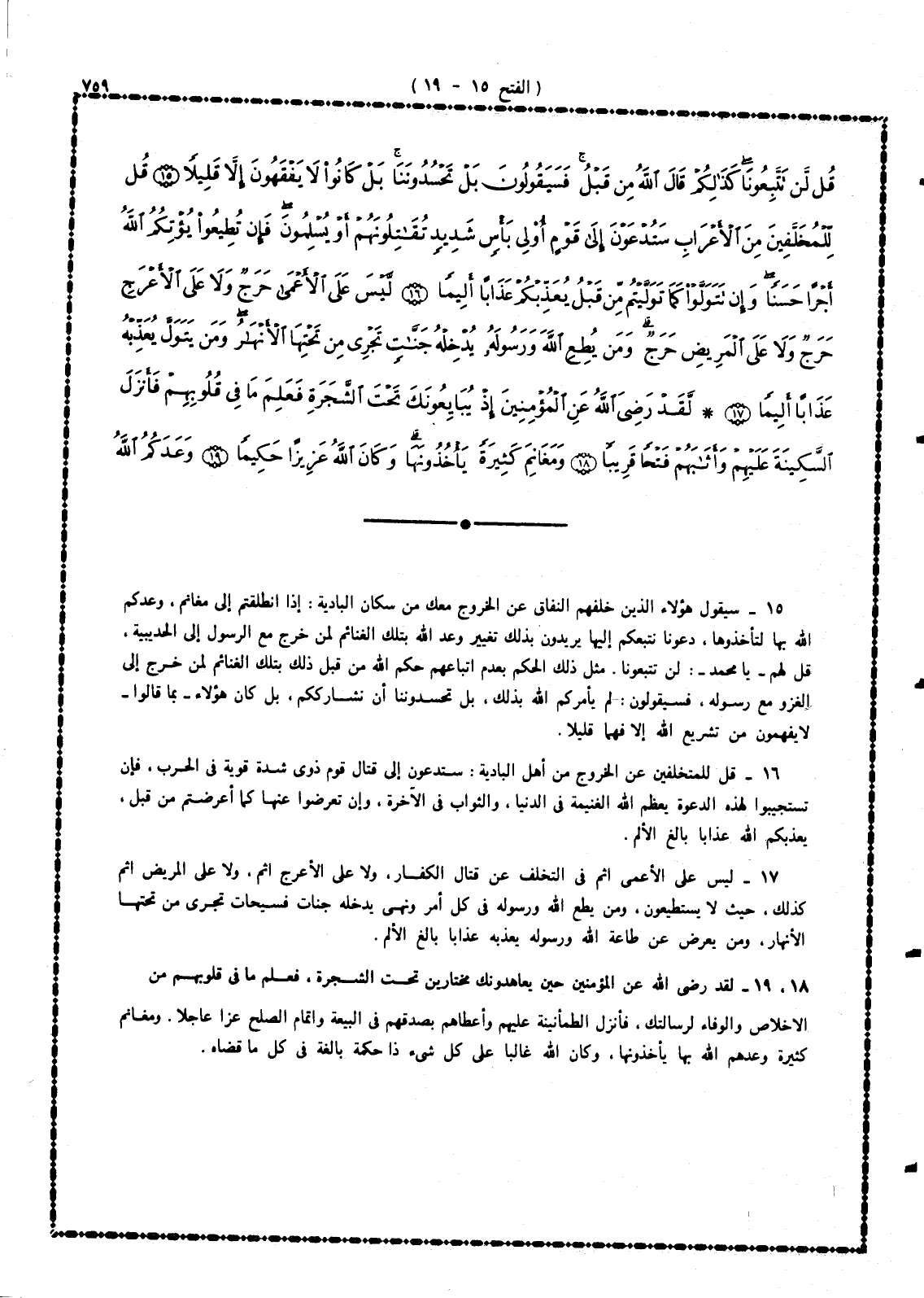 18 -، 19 - لقد رضى الله عن المؤمنين حين يعاهدونك مختارين تحت الشجرة، فعلم ما فى قلوبهم من الإخلاص والوفاء لرسالتك، فأنزل الطمأنينة عليهم وأعطاهم بصدقهم فى البيعة وإتمام الصلح عِزا عاجلا. ومغانم كثيرة وعدهم الله بها يأخذونها، وكان الله غالبا على كل شئ، ذا حكمة بالغة فى كل ما قضاه.