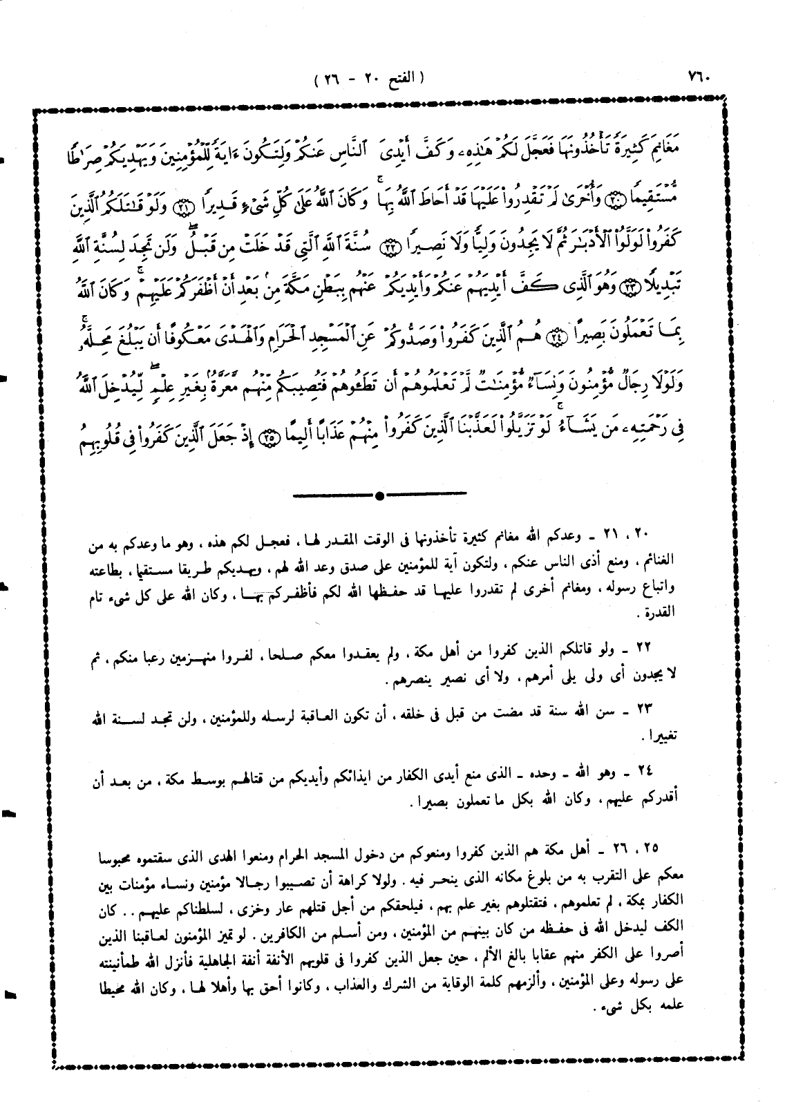 25 -، 26 - أهل مكة هم الذين كفروا ومنعوكم من دخول المسجد الحرام، ومنعوا الهدى الذى سقتموه محبوسا معكم على التقرب به من بلوغ مكانه الذى ينحر فيه، ولولا كراهة أن تُصيبوا رجالاً مؤمنين ونساء مؤمنات بين الكفار بمكة أخفوا إيمانهم فلم تعلموهم فتقتلوهم بغير علم بهم، فيلحقكم بقتلهم عار وخزى، ولهذا كان منع القتال فى هذا اليوم حتى يحفظ الله من كانوا مستخفين بإسلامهم بين كفار مكة. لو تميز المؤمنون لعاقبنا الذين أصروا على الكفر منهم عقابا بالغ الألم، حين جعل الذين كفروا فى قلوبهم الأنفة أنفة الجاهلية، فأنزل الله طمأنينته على رسوله وعلى المؤمنين، وألزمهم كلمة الوقاية من الشرك والعذاب، وكانوا أحق بها وأهلاً لها. وكان علم الله محيطا بكل شئ.