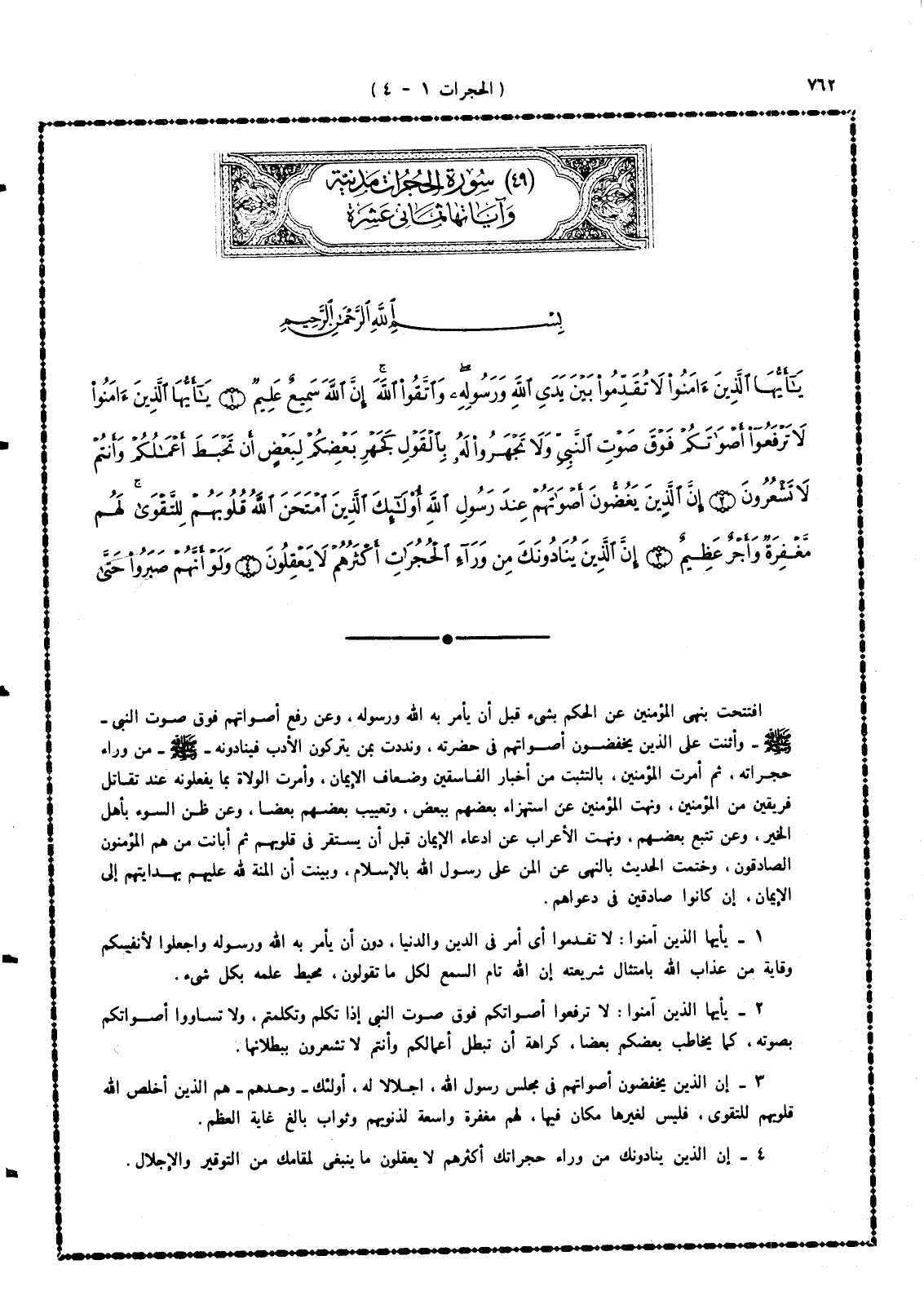 1 - يا أيها الذين آمنوا: لا تقدِّموا أى أمر فى الدين والدنيا دون أن يأمر به الله ورسوله، واجعلوا لأنفسكم وقاية من عذاب الله بامتثال شريعته. إن الله عظيم السمع لكل ما تقولون، محيط علمه بكل شئ.