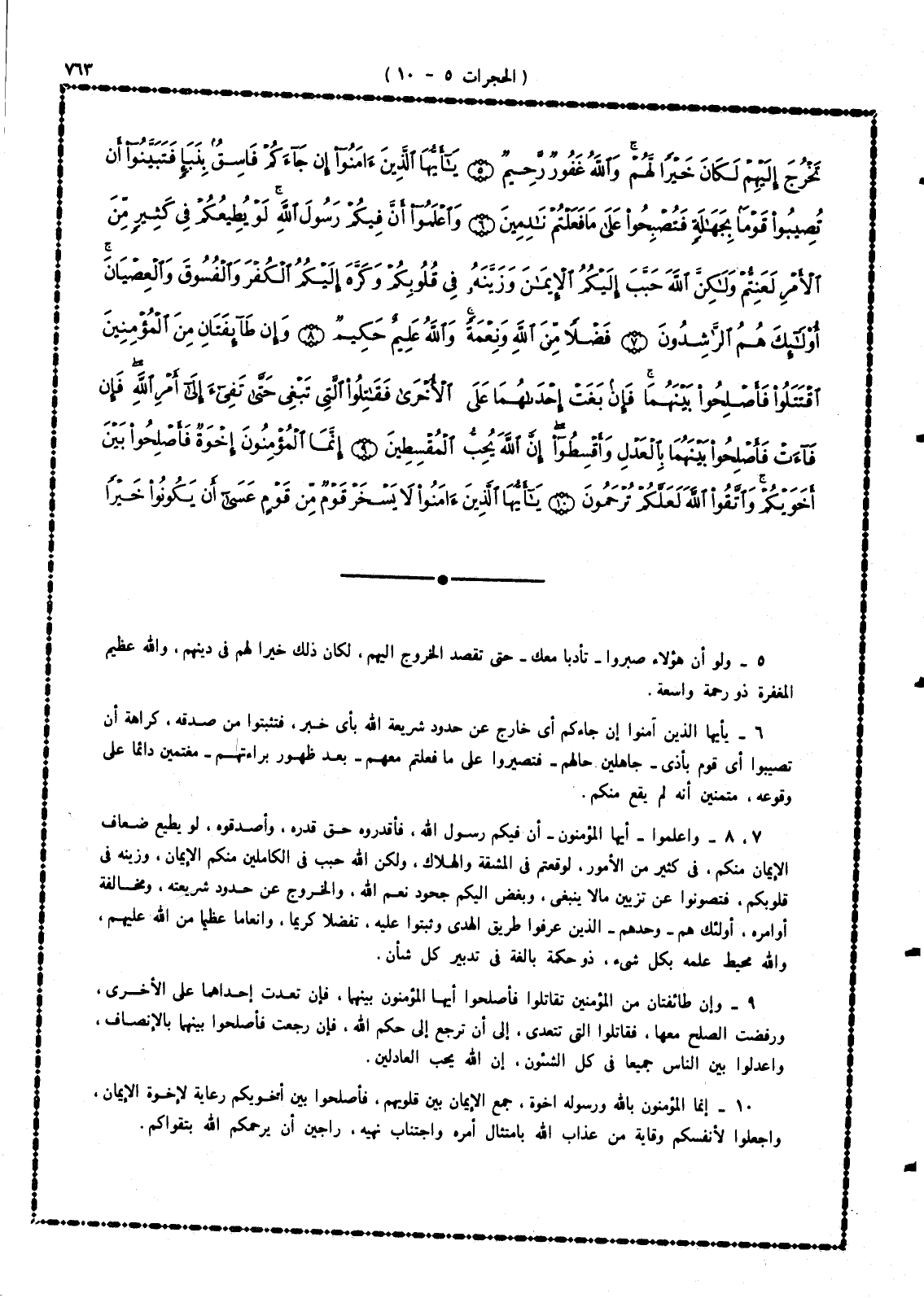 9 - وإن طائفتان من المؤمنين تقاتلوا فأصلحوا - أيها المؤمنون - بينهما، فإن تعدت إحداهما على الأخرى ورفضت الصلح معها فقاتلوا التى تتعدى إلى أن ترجع إلى حكم الله، فإن رجعت فأصلحوا بينهما بالإنصاف، واعدلوا بين الناس جميعاً فى كل الشئون، إن الله يحب العادلين.