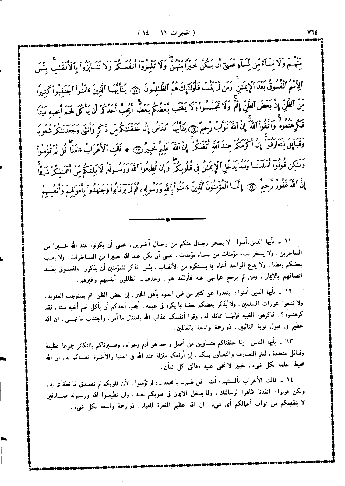 13 - يا أيها الناس: إنا خلقناكم متساوين من أصل واحد هو آدم وحواء، وصيَّرناكم بالتكاثر جموعاً عظيمة وقبائل متعددة، ليتم التعارف والتعاون بينكم، إن أرفعكم منزلة عند الله فى الدنيا والآخرة أتقاكم له. إن الله محيط علمه بكل شئ، خبير لا تخفى عليه دقائق كل شأن.