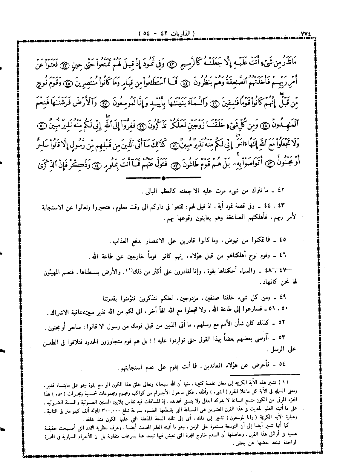 43 -، 44 - وفى قصة ثمود آية، إذ قيل لهم: تمتعوا فى داركم إلى وقت معلوم، فتَجبَّروا وتعالوا عن الاستجابة لأمر ربهم، فأهلكتهم الصاعقة وهم يعاينون وقوعها بهم.
