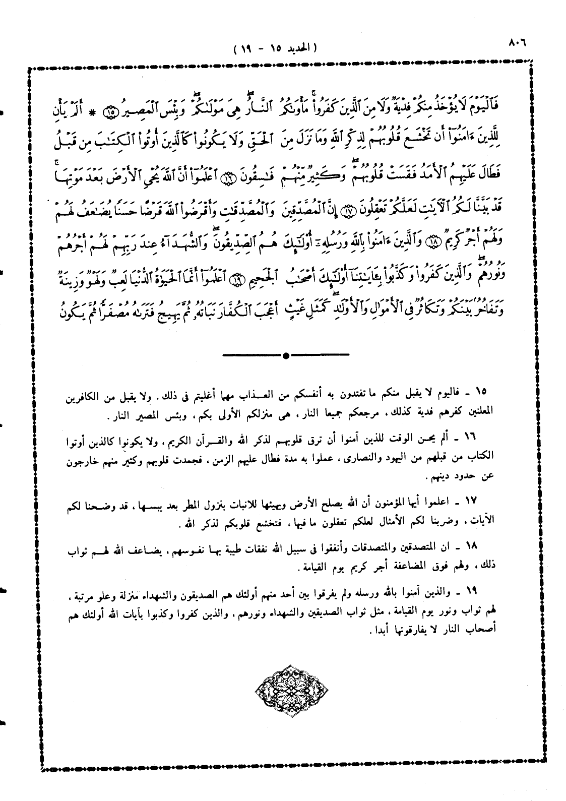 19 - والذين آمنوا بالله ورسله ولم يُفَرِّقُوا بين أحد منهم أولئك هم فى منزلة الصديقين والشهداء، لهم ثواب ونور يوم القيامة. مثل ثواب الصديقين والشهداء ونورهم، والذين كفروا وكذبوا بآيات الله أولئك هم أصحاب النار لا يفارقونها أبداً.