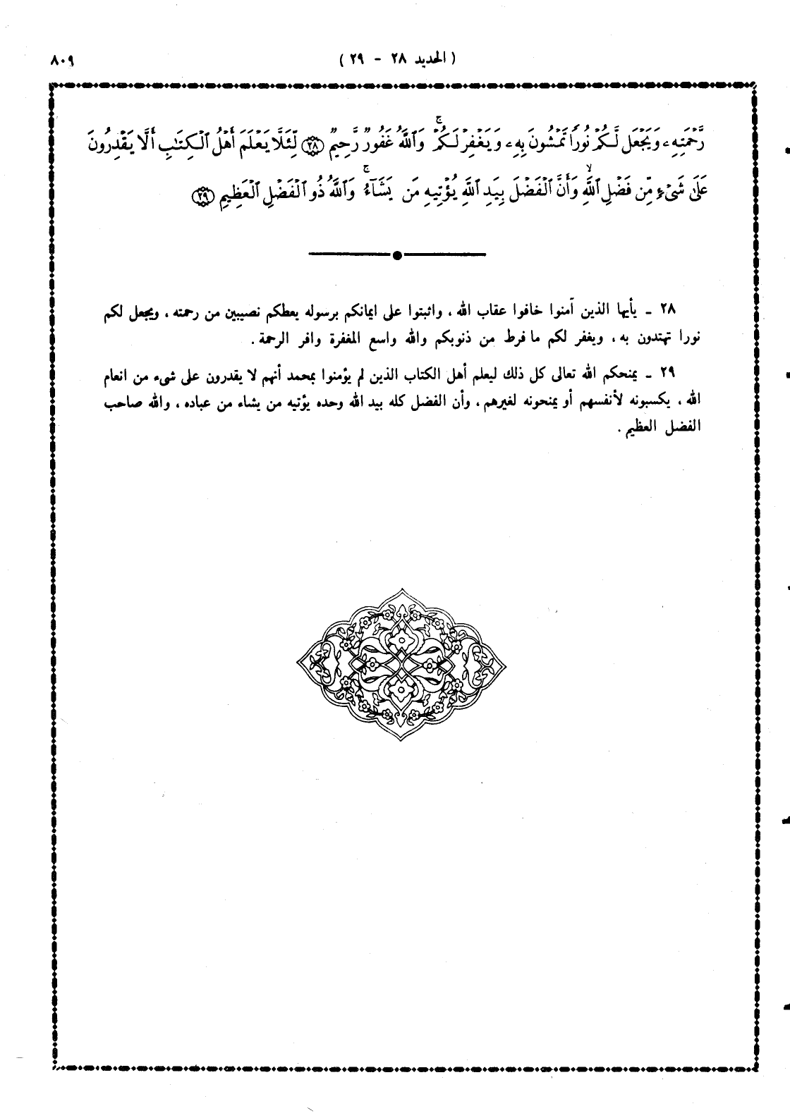 28 - يا أيها الذين آمنوا خافوا عقاب الله، واثبتوا على إيمانكم برسوله يعطكم نصيبين من رحمته، ويجعل لكم نوراً تهتدون به، ويغفر لكم ما فرط من ذنوبكم والله واسع المغفرة وافر الرحمة.