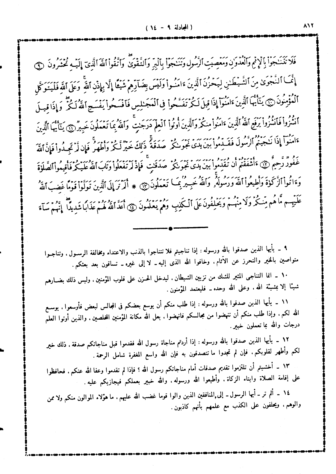 9 - يا أيها الذين صدَّقوا بالله ورسوله: إذا تناجيتم فلا تتناجوا بالذنب والاعتداء ومخالفة الرسول، وتناجوا متواصين بالخير والتحرز عن الآثام، وخافوا الله الذى إليه - لا إلى غيره - تساقون بعد بعثكم.