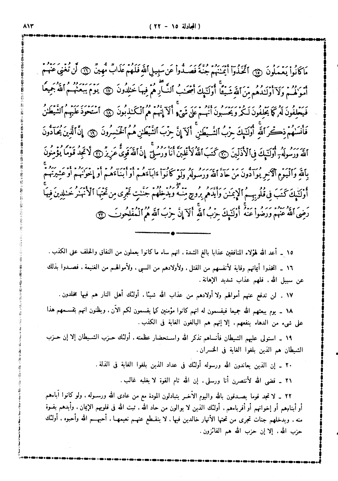 22 - لا تجد قوماً يصدِّقون بالله واليوم الآخر يتبادلون المودة مع من عادى الله ورسوله، ولو كانوا آباءهم أو أبناءهم أو إخوانهم أو أقرباءهم، أولئك الذين لا يوالون من تطاول على الله ثَبَّت الله فى قلوبهم الإيمان، وأيدهم بقوة منه، ويدخلهم جنات تجرى من تحتها الأنهار خالدين فيها، لا ينقطع عنهم نعيمها. أحبهم الله وأحبوه أولئك حزب الله ألا إنّ حزب الله هم الفائزون.