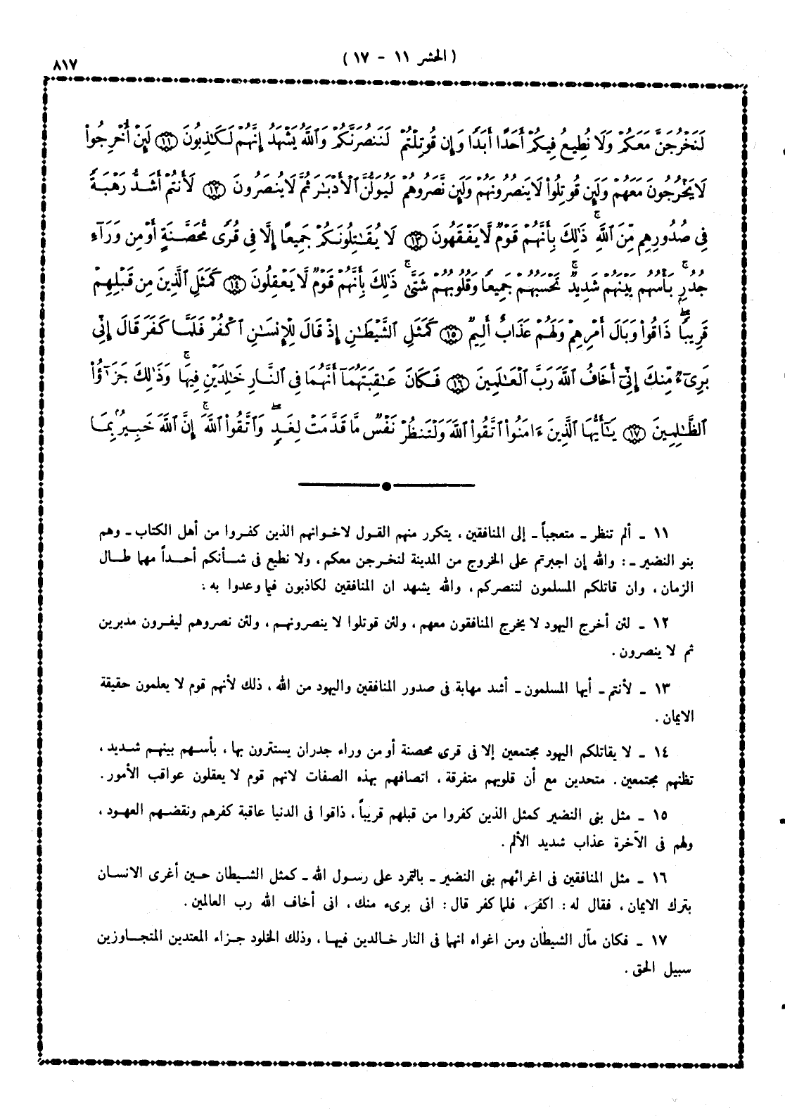 16 - مثل المنافقين فى إغرائهم بنى النضير - بالتمرد على رسول الله - كمثل الشيطان حين أغرى الإنسان بترك الإيمان، فقال له: أكفر، فلما كفر قال، إنى برئ منك. إنى أخاف الله رب العالمين.