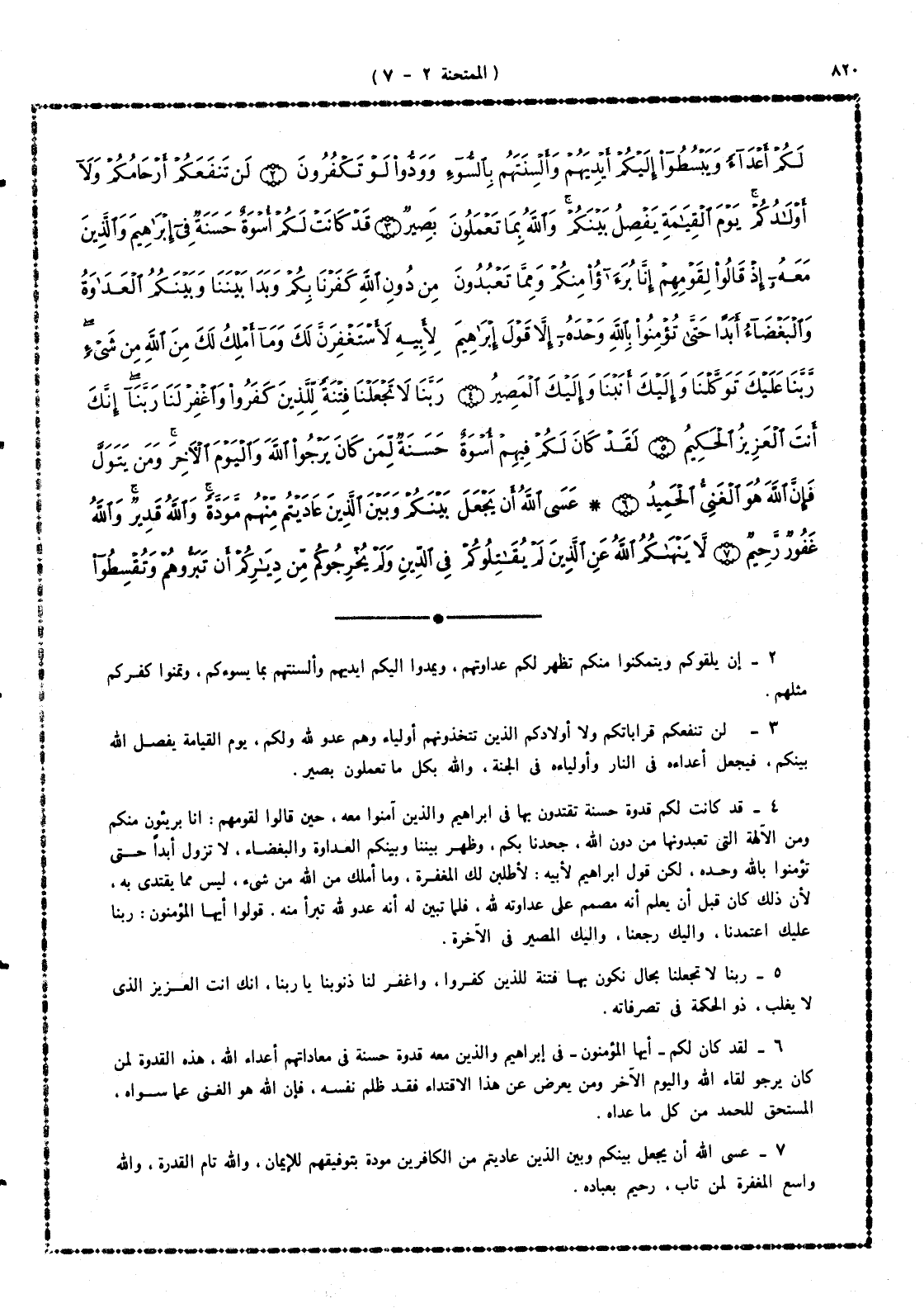 4 - قد كانت لكم قدوة حسنة تقتدون بها فى إبراهيم والذين آمنوا معه، حين قالوا لقومهم: إنا بريئون منكم ومن الآلهة التى تعبدونها من دون الله، جحدنا بكم وظهر بيننا وبينكم العداوة والبغضاء، لا تزول أبداً حتى تؤمنوا بالله - وحده - لكن قول إبراهيم لأبيه: لأطلبن لك المغفرة، وما أملك من الله من شئ - ليس مما يقتدى به - لأن ذلك كان قبل أن يعلم أنه مصمم على عداوته لله، فلما تبين له أنه عدو لله تبرأ منه، قولوا: - أيها المؤمنون - ربنا عليك اعتمدنا، وإليك رجعنا، وإليك المصير فى الآخرة.