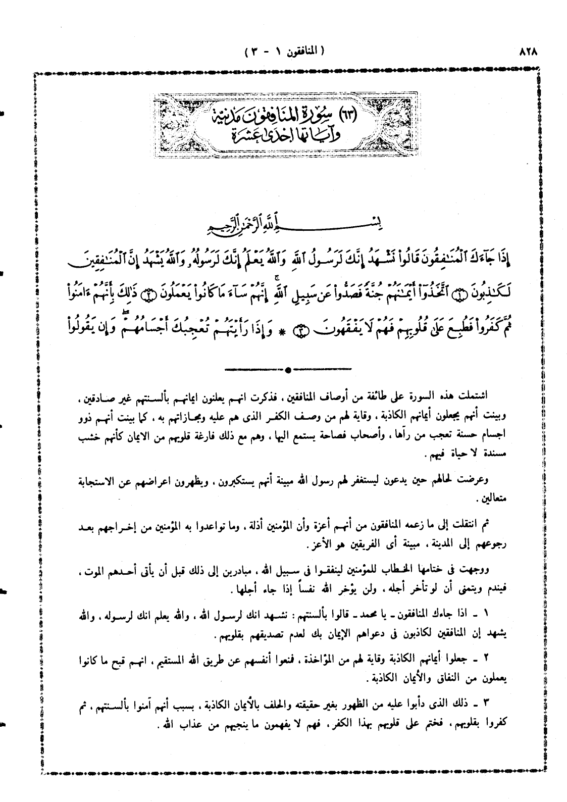 1 - إذا جاءك المنافقون - يا محمد - قالوا بألسنتهم: نشهد إنك لرسول الله، والله يعلم إنك لرسوله، والله يشهد إن المنافقين لكاذبون فى دعواهم الإيمان بك لعدم تصديقهم بقلوبهم.