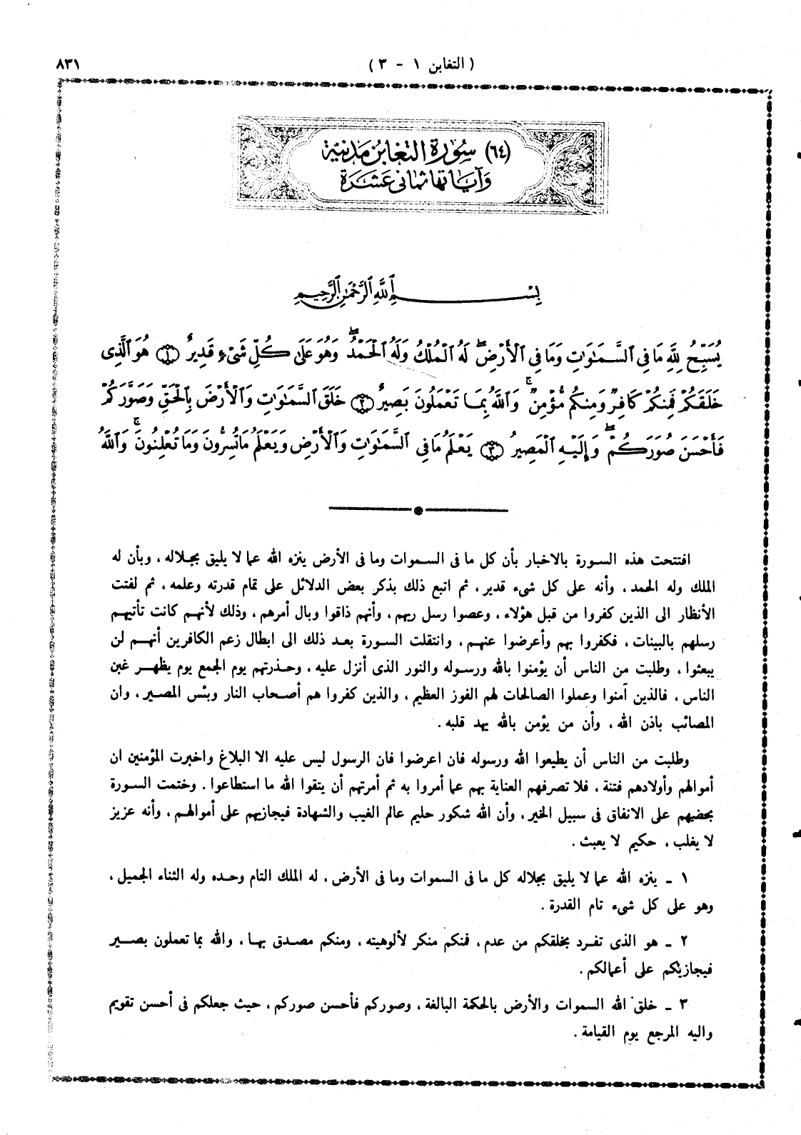 1 - ينزِّه الله عما لا يليق بجلاله كل ما فى السموات وما فى الأرض. له الملك التام - وحده - وله الثناء الجميل، وهو على كل شئ تام القدرة.